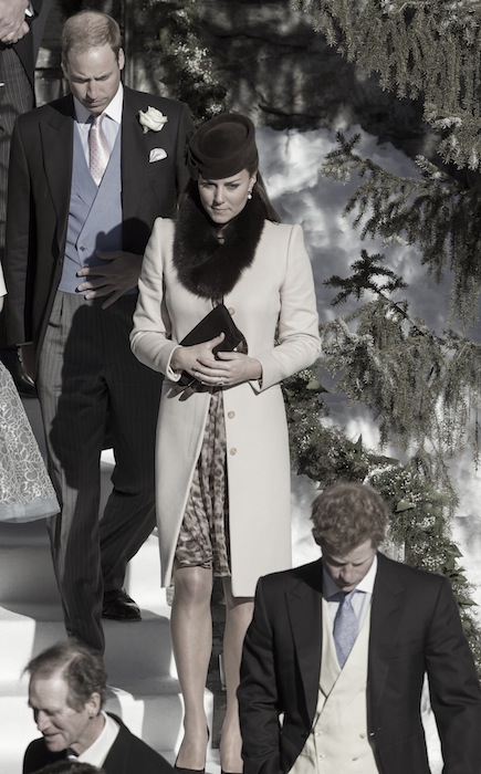 catching up: Catherine, Duchess of Cambridge attends a wedding on March 4, 2013 in Arosa, Switzerland with Prince William. Pregnant Kate is wearing a MaxMara coat and dress, and the second time we see her wearing the look. Prince Harry joins them (bottom right) to see the wedding of polo player Mark Tomlinson to Olympic gold-medallist Laura Bechtolsheimer.