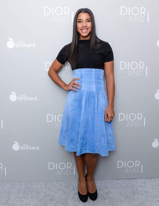 Lexi Boling wore a Dior blue, black and white jacquard lurex top and black pleated silk shorts. She also wore Dior shoes and a mini “Lady Dior” handbag.