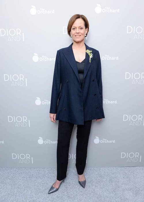 Sigourney Weaver wore a Dior navy cotton and silk toile jacket, black wool pants.