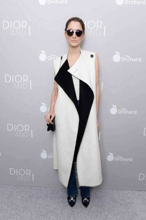 Sofia Sanchez de Betak in Dior off-white and black sleeveless cashmere coat, Dior sunglasses + “Diorama” handbag.