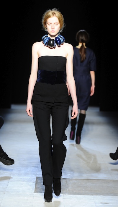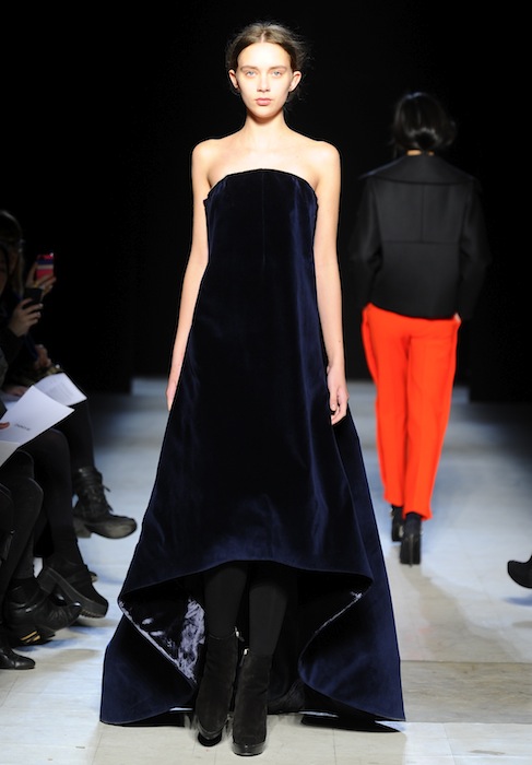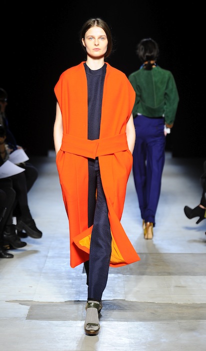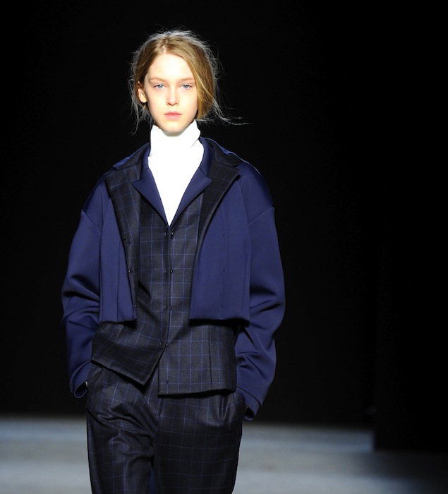 The ensembles were seamed with purpose and pieced or cuffed for proper, details added interest to simple suited trousers and blazers. Playing against the clean and structured lines of tailored pants and boxy tops in neoprene and flannel, the coats were relaxed but not sloppy. Richly colored toppers in black currant, persimmon, and beetle green were sleek, with roundly sloping silhouettes sitting a few inches off the shoulder and a slightly exaggerated trapeze shape things get retro. Bell added, “I wanted to create wide shapes [to make you wonder], ‘What’s under that?’”