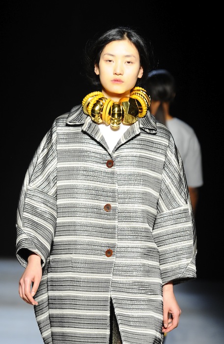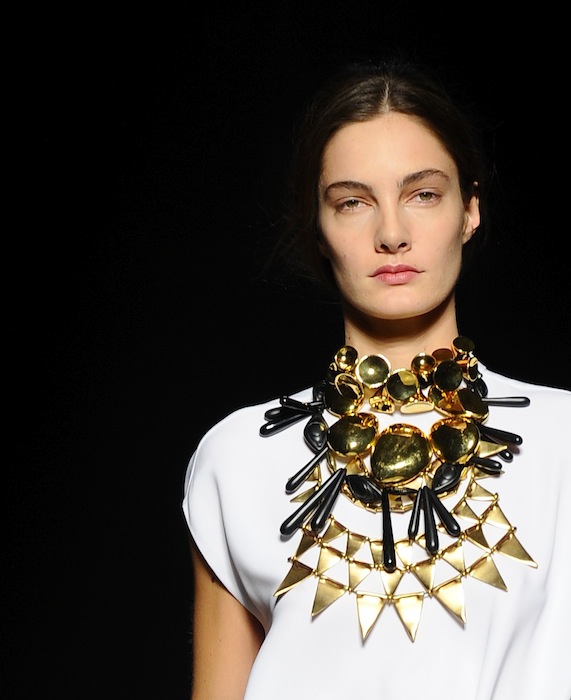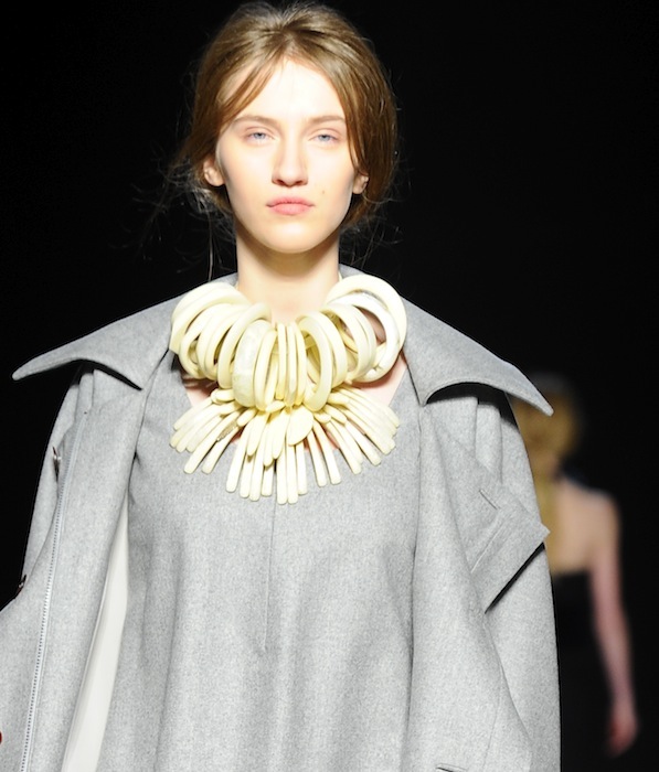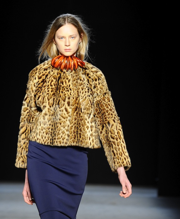 Looks were styled with large chunky necklaces strung with fist-size resin bangles from Dinosaur Designs of Australia, which Bell hoped would add “something worldly” (and almost tribal-esque) to his designs. Unlike Bell’s spring girl–who was lost and desperately roaming the desert, fall’s muse knows exactly where she is going. She has a view of the past, but she’s looking forward, and that duality was reflected in the clothes. fdmLOVES Chadwick Bell fall 2013 selects Bell by Brigitte Segura. Commentary by Barii Suzuki-Bell, written by Sarah Freiseis.