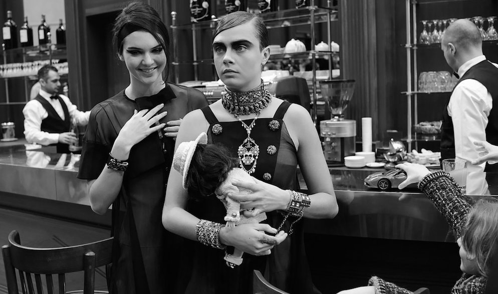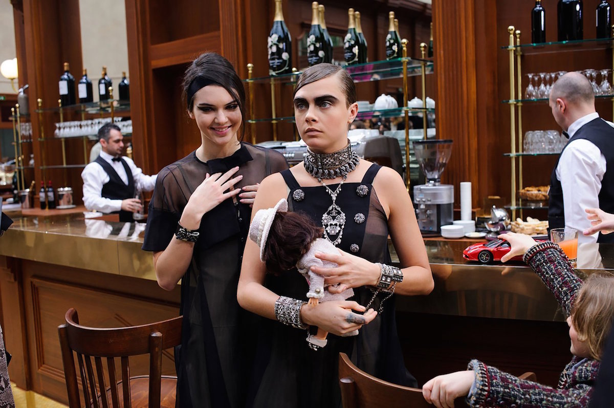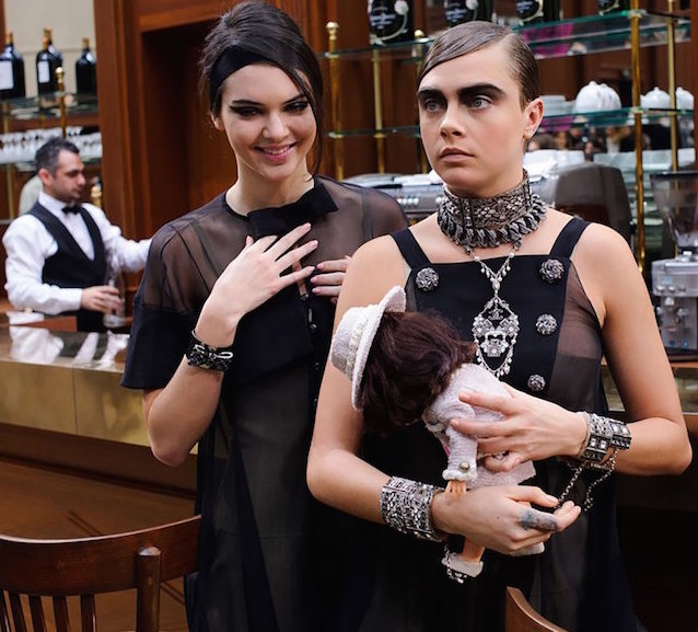 Taking in the CHANEL collection, what’s not to love. From the embellished texture to modern new shapes, and the floor tile pattern that blends with the runway floor, Karl presents fashion with a smile. On that note, we loved the CHANEL DOLLS at the fw15 collection during PFW. Not only carrying a doll, Cara Delevingne and “friends” including Kendall Jenner, Ondria Hardin, and a couple of newcomers in the club were dolled up, literally.