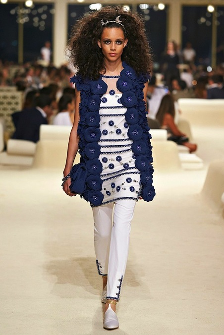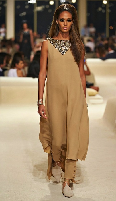 Joan Smalls has garnered lots of buzz for her caramel ensemble, which has been lauded by various Middle Eastern fashion lines in attendance. The crescent moon-shaped head accessory has got us gushing. Or it was probably the signature intertwining C’s. Or both. We’re all over the pattern mix not to mention the curly hair- which Lindsey convinces us fabulously to go big. HIGHLIGHTS from CHANEL resort 2015 DUBAI selects by Brigitte Segura, written by Paul Cenizal.