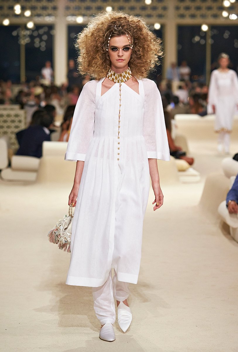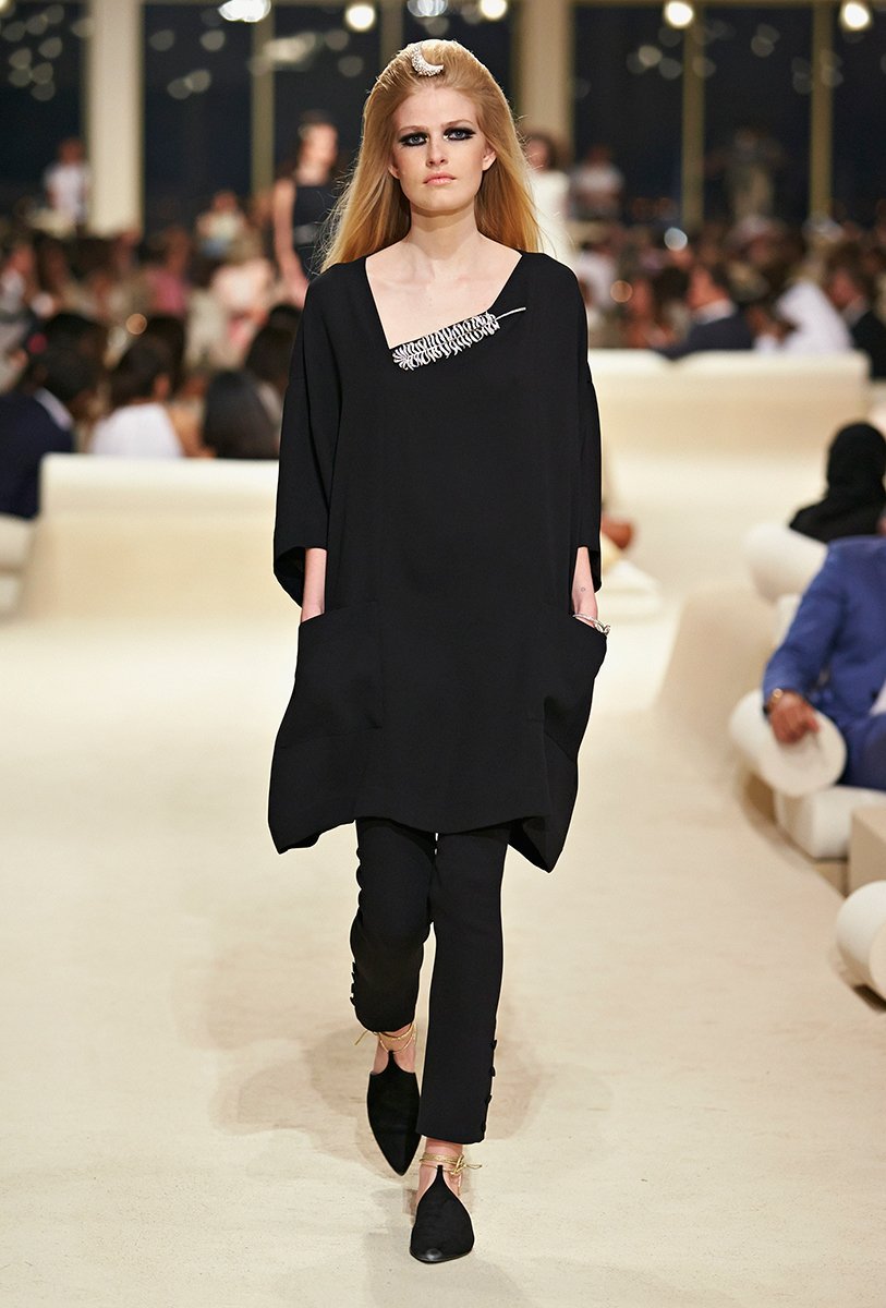 Ever the trendsetter, Chanel has created noticeably conservative pieces for this showing. The top part of outfits are mostly oversized, paired either with narrow pants or harem pants, which is a nod to Coco Chanel’s ability to make menswear look very feminine. Another apparent nod unique in the collection is that to other characteristically Arabian elements. Among them was the abayah, which found its way in the layers of some of the pieces.
