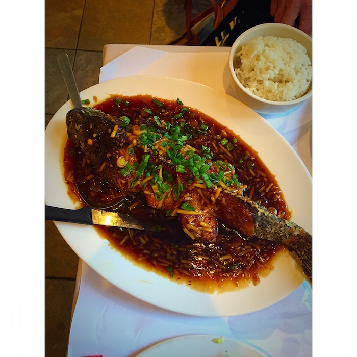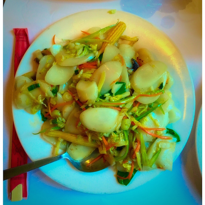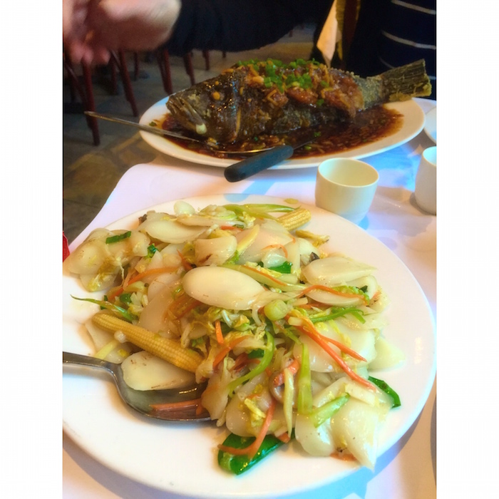 We tried the tropical spicy mango mojito + ‘a perfect storm’ to start. Thirty minutes later, after browsing the extensive menu and asking the extremely patient waiter at least 20 questions, we finally ordered a couple of special dishes. The crispy whole sea bass, which was coming in a very special sauce, a spicy tuna roll from their japanese menu, and the old Shanghai rice cakes – the ultimate surprise du jour. Though we asked the waiter few different ways about the rice cakes while looking at the picture before ordering, we couldn’t really understand what this yummy concoction to come was. It looked like vegetables in the pic – sort of like water chestnuts.