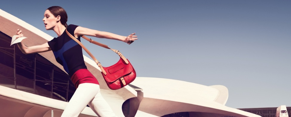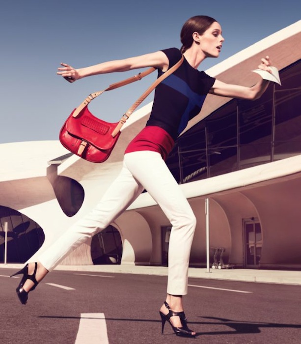 Reflecting the architectural theme of Longchamp’s Spring 2013 collection, the campaign was shot in the former TWA Flight Terminal of New York’s JFK airport, designed by architect Eero Saarinen. Belgian-born Salim Gauwloos, noted for his high-profile collaboration with Madonna on her iconic Blond Ambition Tour, is the choreographer for the campaign shot by Max Vadukul featuring COCO ROCHA.