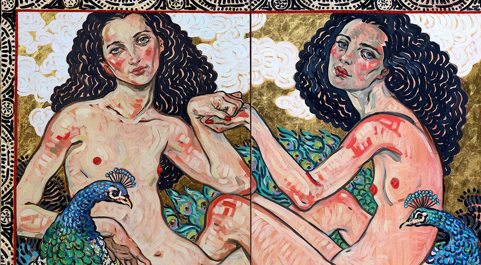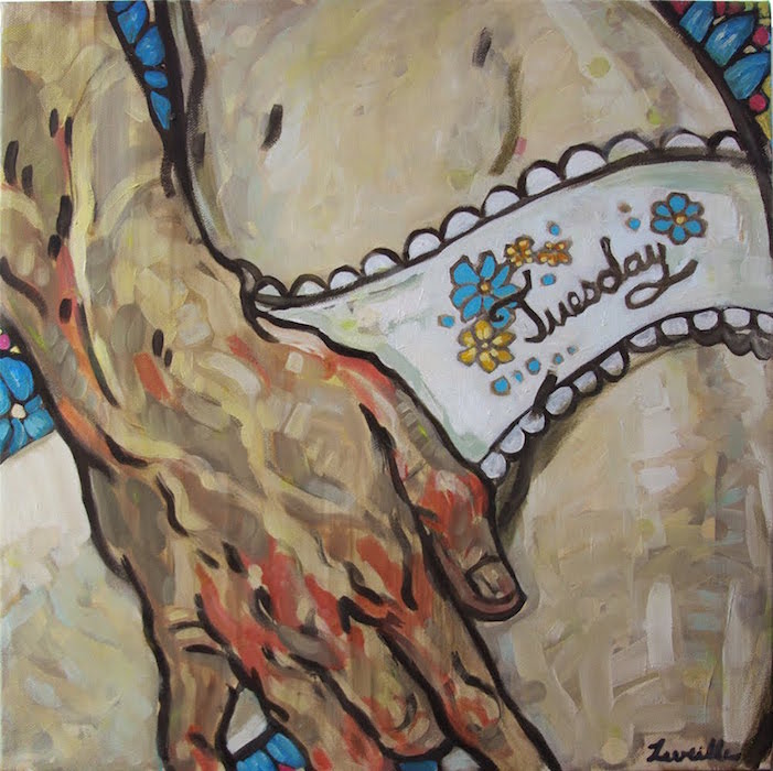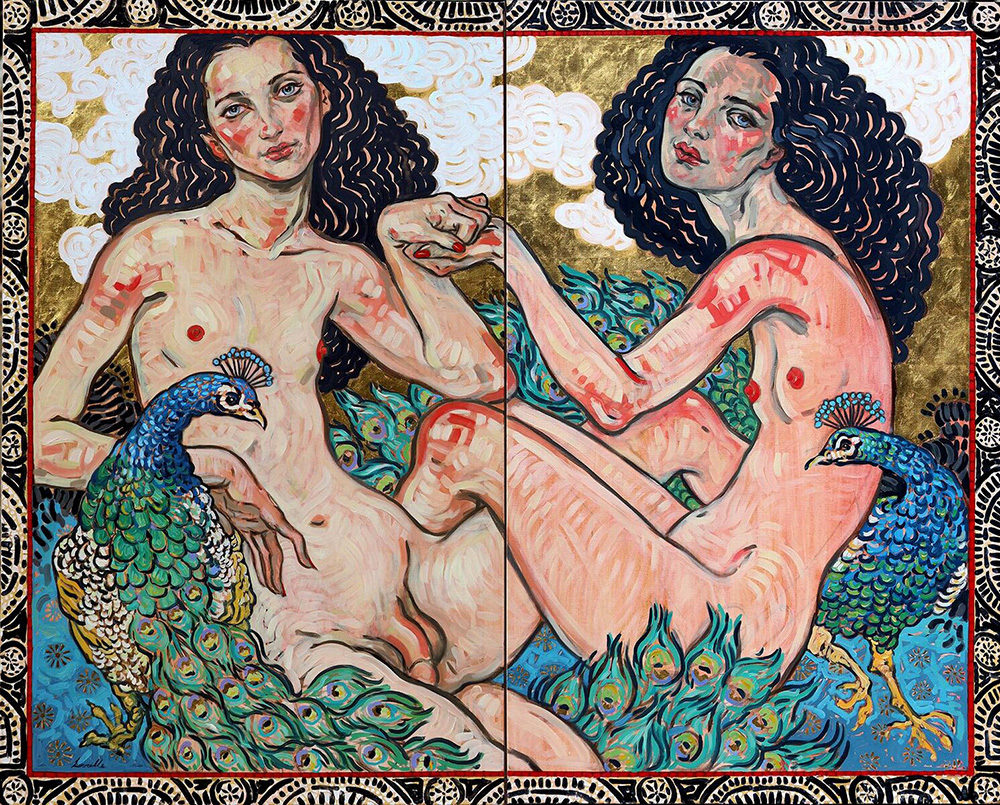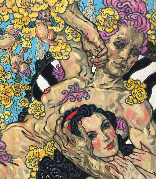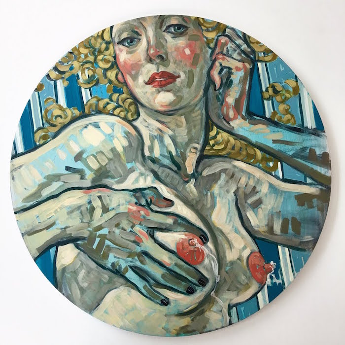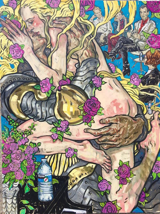 “We evolve within a state of cultural influence. Things we perceive to be ideals are often built upon faulty, weak and diseased foundations set forward and reinforced by society and pop culture. We are made to fall in love with an arbitrary set of stereotypes, physical ideals or cultural goals that are twisted and often deeply damaging to us. My last body of work entitled “Crush” was an exploration of these themes. I continue the dialogue by exploring what happens once we cross to the other side of social constructs, the fairytales that we are raised with. Thus, this new body of work is titled “The End of Love.” What comes after delusions of “love?” Feminine power and sexuality find new ground, as does an urgency to assert the female gaze. The female gaze must find a stronger manifestation; it is too often expressed as a reinterpretation of the male gaze. The ambiguity and multiple meanings implicit in “The End of Love” provide a rich internal dialogue surrounding the nature of sex and myth in contemporary culture. The end of love can be the physical climax. It can be the trickery of biological need for reproduction. It can be the apogee; the farthest reaches of the meaning of romantic love. Despite my calling to language, symbol and figure, my work must have its own life beyond language. The material of the paint itself and the lushness of the determined line hold their own power of meaning. The work originates in words and symbols but it does not conclude in a form that can be expressed simply by language.” – Rebecca Leveille