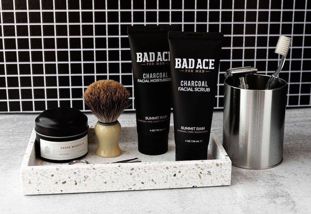 First up: Charcoal never felt so good! A Charcoal facial scrub designed for men, the dark grey color gets lighter with lather, with a fresh ‘summit rain’ scent. If you want to have fun with it, put the scrub on dry skin and see yourself transform to a silver faced superhero ~ ready to wash off in the shower. Bad Ace charcoal facial scrub. It’s a little young and perfect to remind dad to have fun.