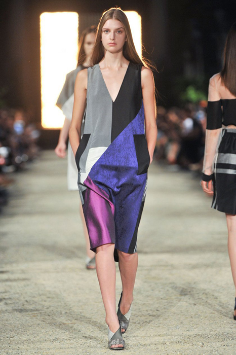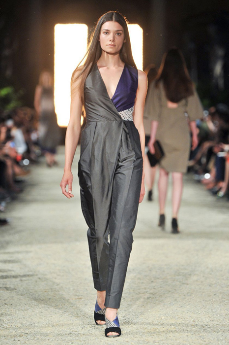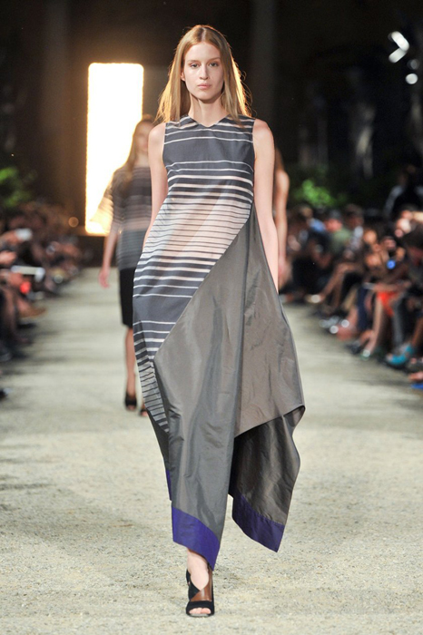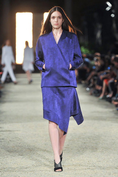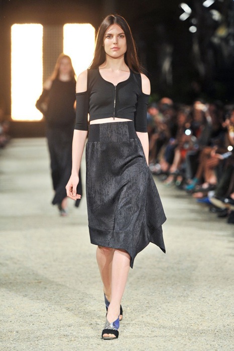 Damir Doma stepped away from his modern gothic aesthetic for his Resort 2014 collection. Dark hues are featured but the color palette is more subtle, softer than what we’re used to from this designer. The silhouettes are long, sleek and so attractive on the strutting models. He even included the new “it” skirt length that’s trending this season. The midi length (slightly below the knee) is taking the place of long boho and mini skirts. It’s a mature length that’s evolving with the modern female shopper. As she grows up, so do the silhouettes…and they look so now.