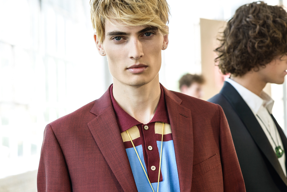 Favorites include the tone on tone blazer with tropical trees in blue and ochre, and the polo shirts in earthy vintage vibes… ok, and the striped yellow sweater too. The universal appeal of the collection in evident with the variety pack of models which range from preppy to big hair cool. Just enough special touches on very wearable menswear pieces in hot color combos. Exactly the fresh the man wardrobe needs. Diggin’ this collection big time. Here’s a glimpse of a few favorites from the presentation held at Industria Superstudios.