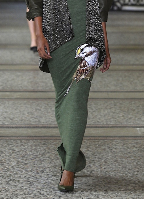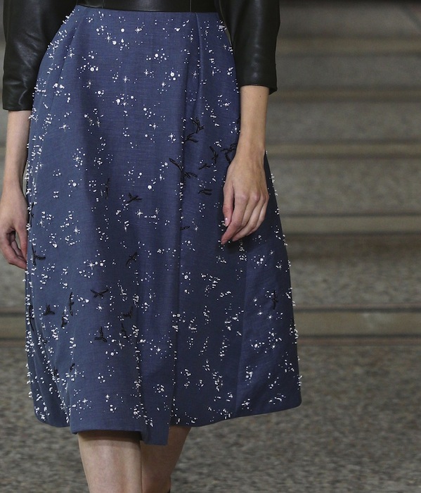 The embellishments show off the skilled work of the Lesage workshop with an expertise in embroideries: birds scatter over the length of a skirt, a sparrow delineated in thread on a tube dress in army green polo knit, and stars placed over a denim dress.