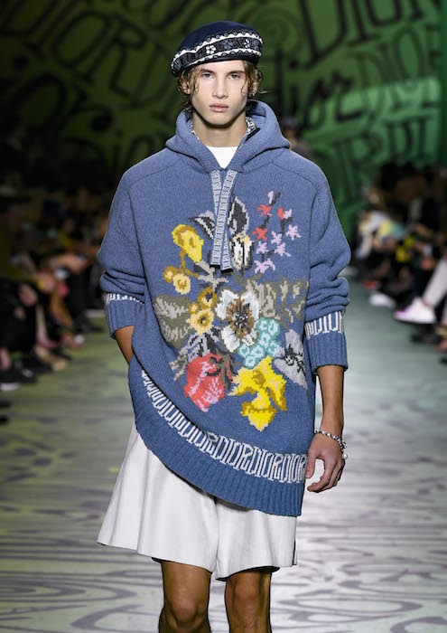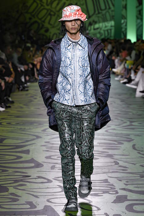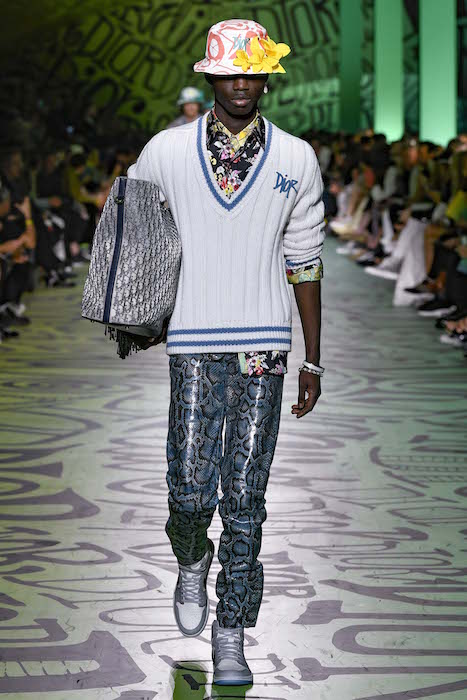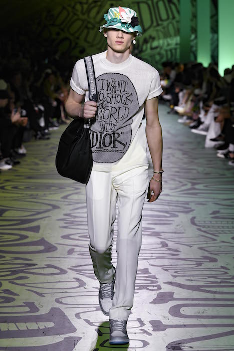 “THE HOUSE HAS ALWAYS CULTIVATED A PASSIONATE RELATIONSHIP WITH ART, AND THIS FASCINATION IS AT THE HEART OF DIOR’S INVENTIVENESS NOW MORE THAN EVER. IN THIS SPIRIT, KIM JONES’S SHOW IS BEING HELD ON THE EVE OF THE INAUGURATION OF THE ART BASEL MIAMI FAIR. THE SHOW SPACE, WHICH IS DIRECTLY ACROSS THE STREET FROM THE RUBELL MUSEUM, IS ALSO OWNED BY THE RUBELLS, AND WAS CHOSEN AS AN ODE TO MONSIEUR DIOR’S FIRST VOCATION AS A GALLERIST BEFORE HE BECAME A COUTURIER. THE LINK CONTINUES IN THE COLLECTION ITSELF, THROUGH KIM JONES’S INVITATION TO THE ARTIST AND DESIGNER SHAWN STUSSY*. POSITIONED AT THE INTERSECTION OF COUNTERCULTURE AND THE CREATIVE WORLD OF SURFING, THIS MAJOR, MULTIFACETED TALENT HAS REINVENTED THE DIOR LOGO IN A GRAFFITI STYLE AND CREATED NEW PRINTS. HIS VISION IS ALSO INTERPRETED IN JEWELLERY BY YOON AHN. CONCEIVED AS AN IMMERSIVE INSTALLATION, THE SHOW’S SCENOGRAPHY PLUNGES THE AUDIENCE INTO THE ARTIST’S UNIVERSE: THE RUNWAY IS TRANSFORMED INTO AN ABSTRACT BARREL WAVE LIT BY A SUNSET AND TAGGED WITH MYRIAD ITERATIONS OF THE LETTERS IN “DIOR”. A CELEBRATION OF FREEDOM: OF MOVEMENT, CREATION AND SPIRIT. A JOIE DE VIVRE DIOR HOLDS DEAR.”