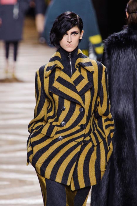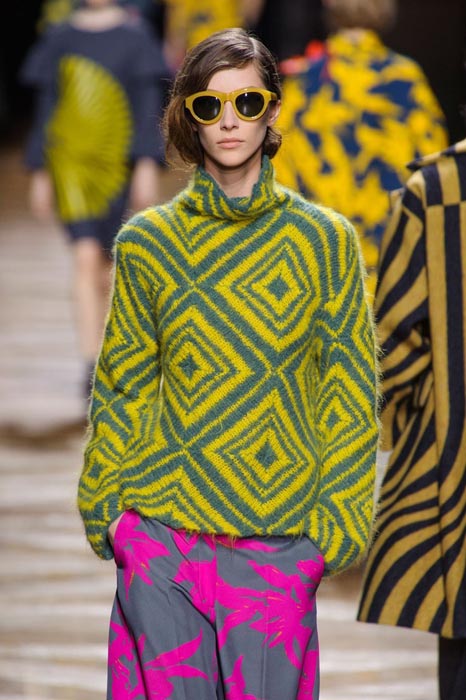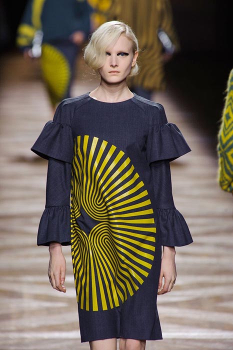 Dries Van Noten’s Fall 2014 collection is just like looking through a kaleidoscope. Shown during PFW, this psychedelic set is taking cues from Op Art swirls and stripes. With 1960s undertones, it’s hypnotizing and retro chic. Colors are varied, prints are mixed and there’s an underlying feeling of cool throughout. This is how you do memorable.