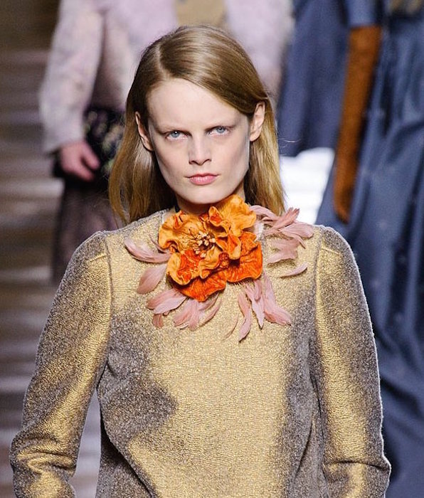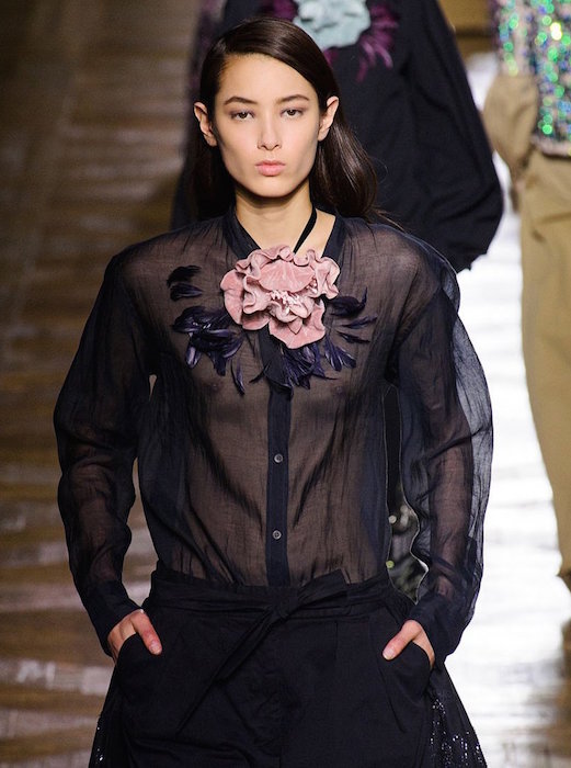 A textured harmony of layers with a floral eloquence at DRIES VAN NOTEN fall 2015 PFW. Sweet oversized flowers are the perfect neck candy to go over sheers or layers of jacquards and brocades. Familiar faces shining include Hanne Gaby Odiele and Julia Nobis. Here are few favorites from the patterned king.