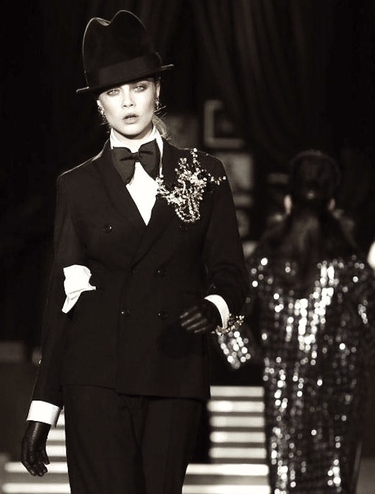 Gowns trailed the runway in a romantic sway, with jewels decorating hanging necklines and delicately lined fluttery fabrics endlessly. Of course, some of the pieces featured the label’s signature tailoring with zaps of pink and yellow. Cara (Delevingne) was all Bowler Hat and Bow-tuxed, sporting a DB blazer and tapered trousers, while new face Tsheca owned the fab jolt of yellow layered over a menswear suit we loved, and Daphne was working the smokin’ attitude, cigarette holder and all.