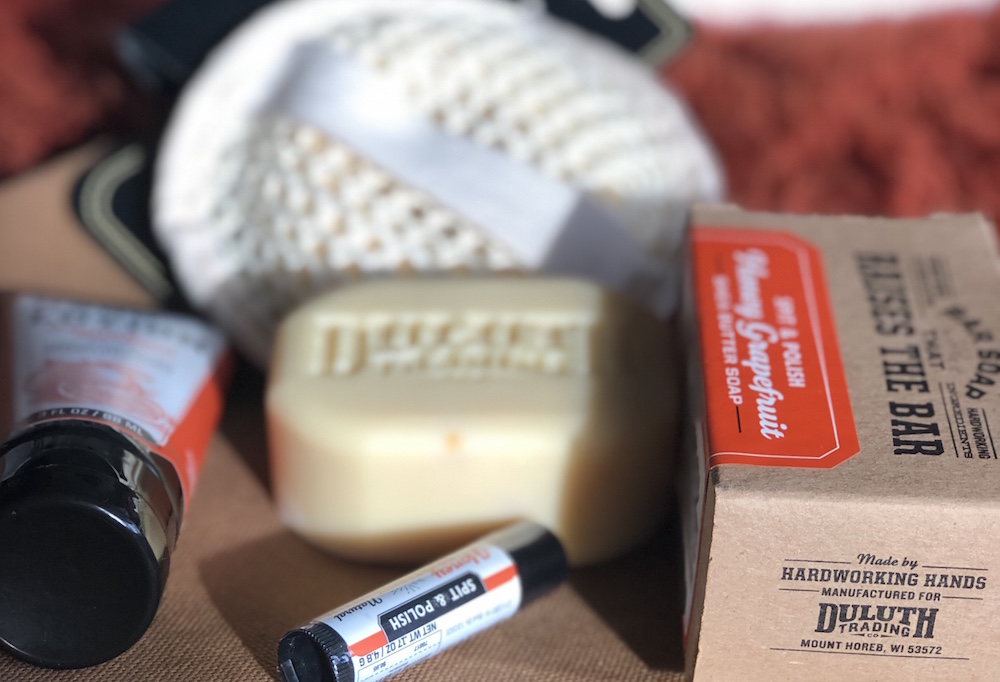 - DULUTH TRADING ‘spit and polish‘ men’s grooming products are the perfect rugged man casual gift. Vintage packaging and (not too) fragrant soaps, hand lotion, hand scrub, and washes.