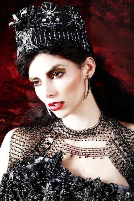 Look 7: Corset: The Blonds | Crown: Lisa Marinucci | Chain cape: Eugene Welsh | Earrings:CZ by Kenneth Jay Lane | Background painting: Jordan Eagles