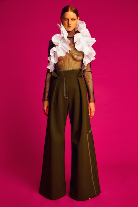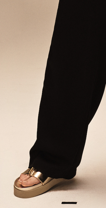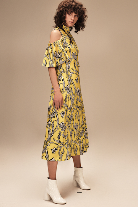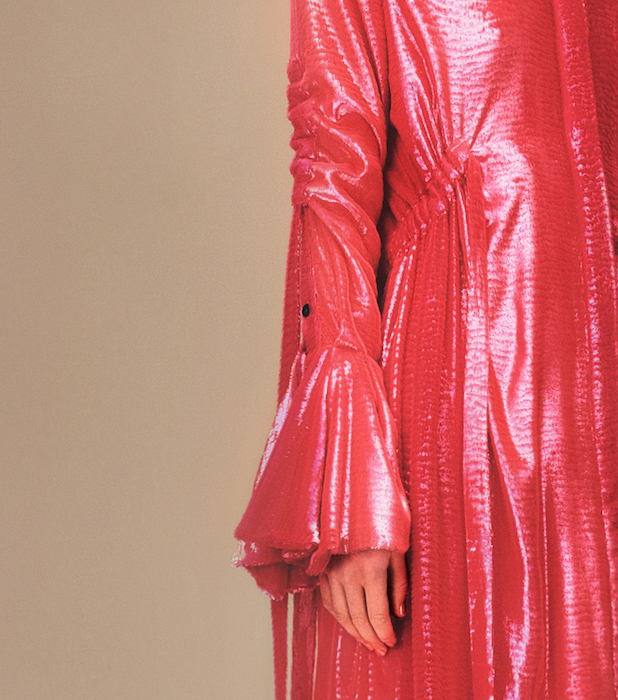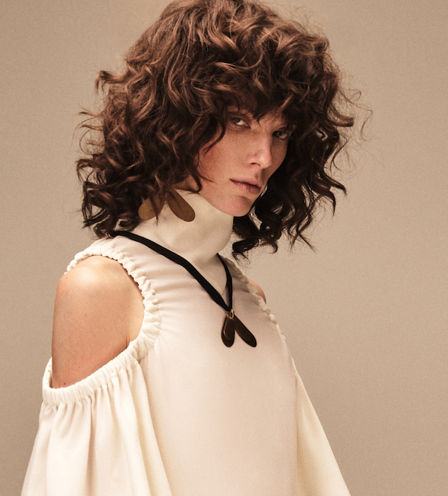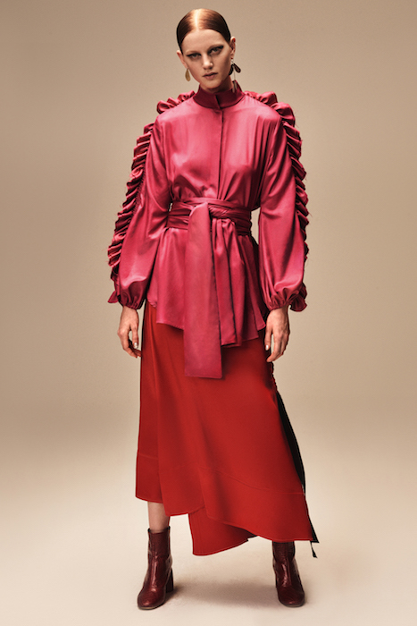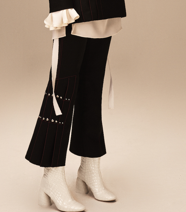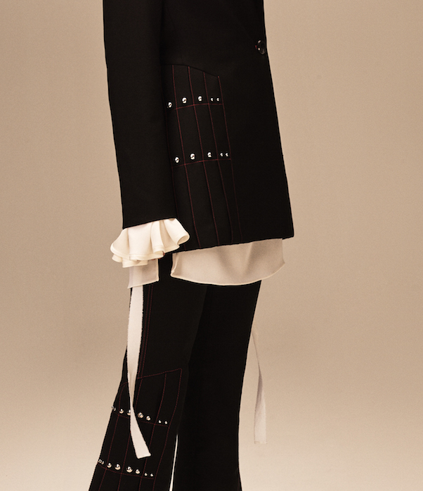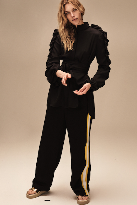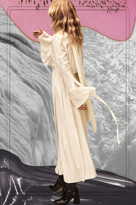 The mininal romantic. ELLERY charms the modern for resort 2017. Modest details with cutouts, a few ruffles on the cuff, and variations of bell shapes fuse with new tailored shapes. A flirty dash of metallics mix with modern athleisure, and cool midlength curls to accessorize..
