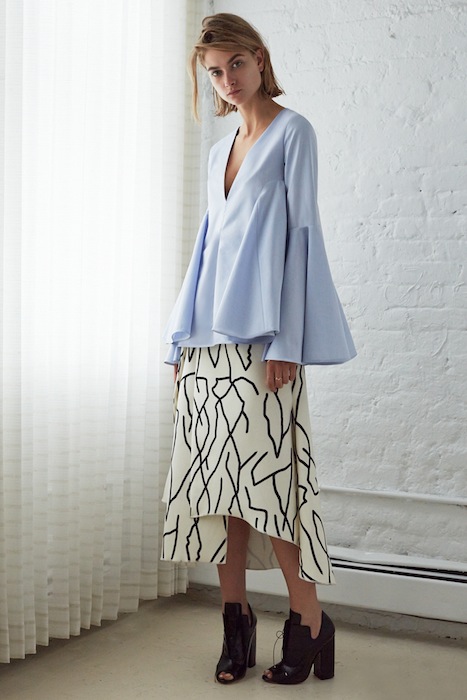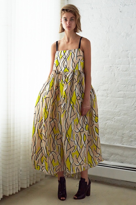 Sweet, clean, modern and a hint of girly. For resort 2015, Ellery was inspired by suburban swimming pools. David Hockney’s pool series with aquatic themes inspired the eclectic abstract prints that Echoed hints of his infamous brushstrokes. The shaped solid silhouettes were most noticeable in crisp white and indigo.