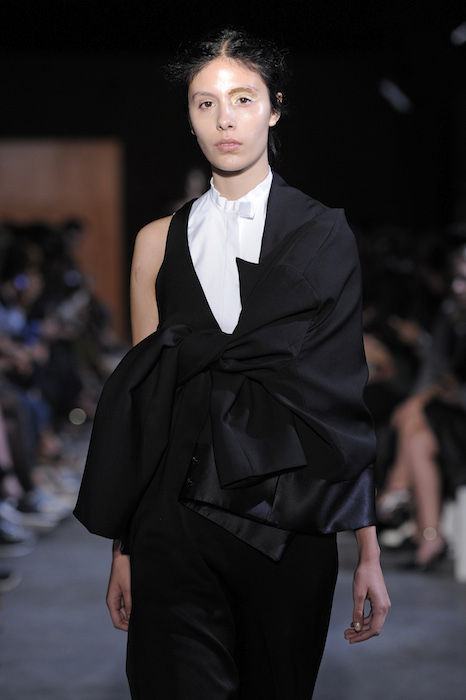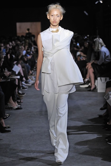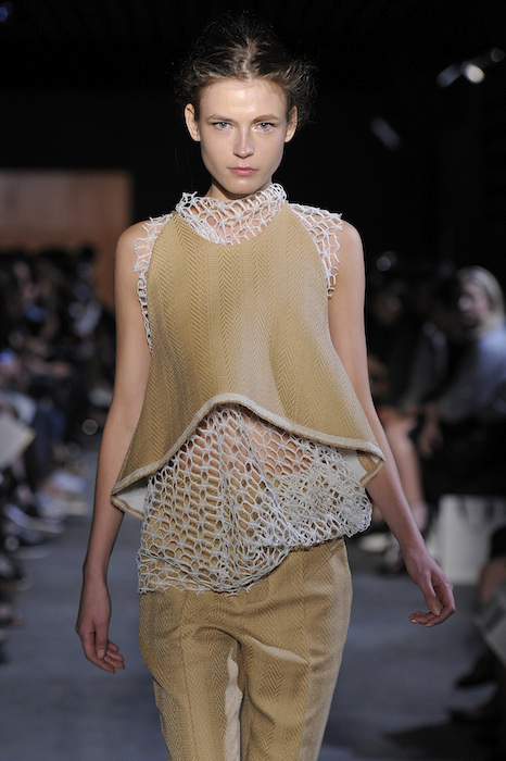 A tweed ensemble with mesh undershirt exemplified both interesting construction and vivid texture. Ellery stuck with a lean silhouette but the looks were neither boring nor repetitive. Though some pieces could’ve benefitted from a little more structure, a shifty fit still flattered the movement of the garments. Gathered excessive fabric that was consistent throughout most pieces created a very flowy, almost freeform ruched texture that caused the light sheen of the fabric to reflect beautifully. Crossed sleeves also offered a unique design.