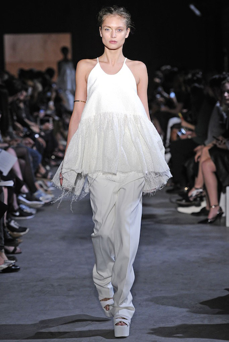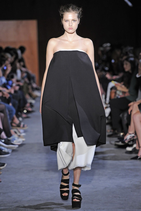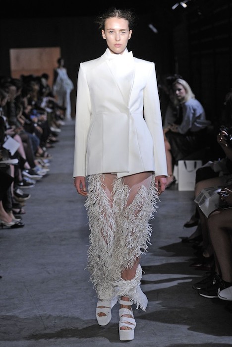 Ellery additionally ventured to reinvent formal wear. Trousers paired with loosely fit, fringey tops provided a fresh outlook on this concept, especially when it was inverted. A fringey pair of trousers with a more structured jacket. The idea was risky, maybe even lacked solidity, but the risk was taken and out of it came a collection that provided both elegance and straightforwardness. ELLERY spring 2015 PFW selects + edits by Brigitte Segura, written by Andrea Porro.