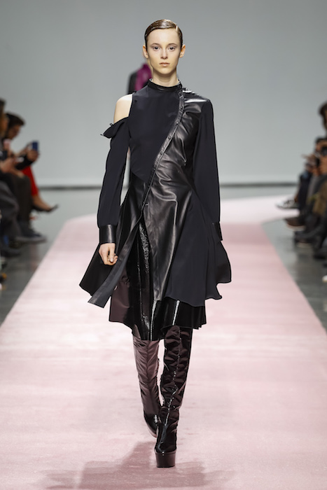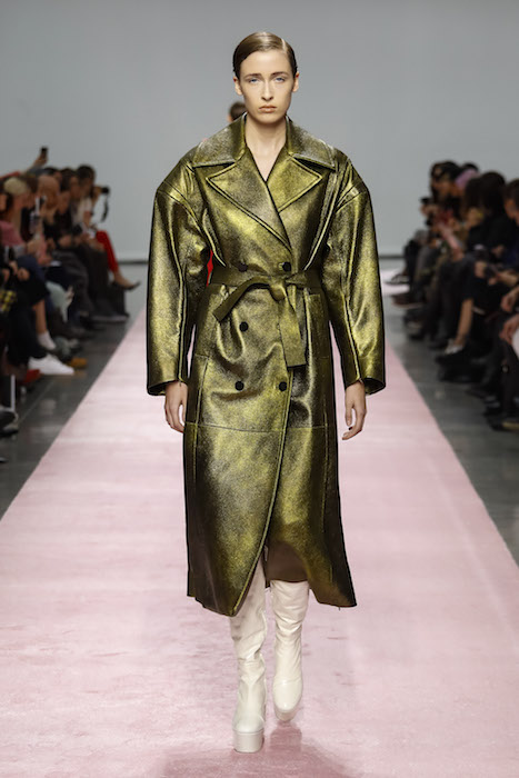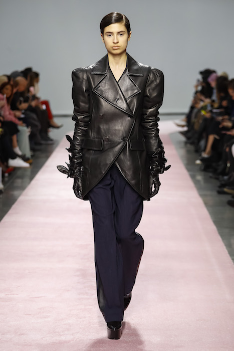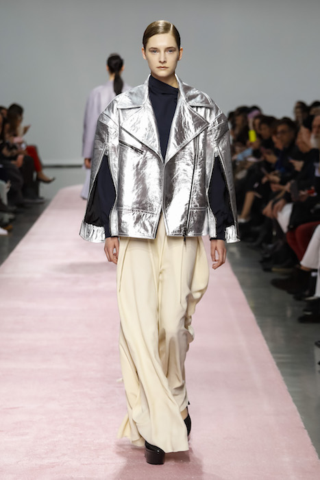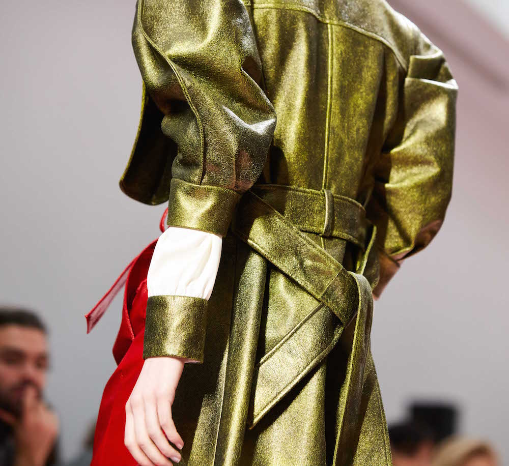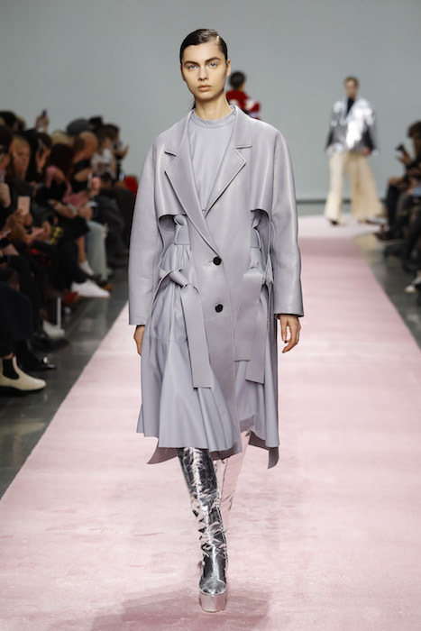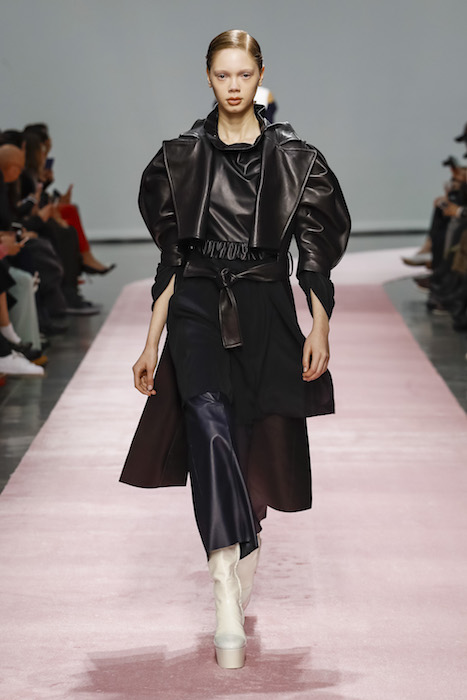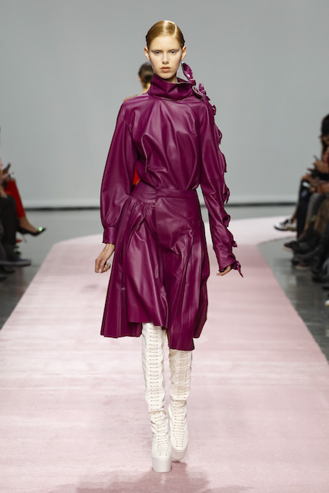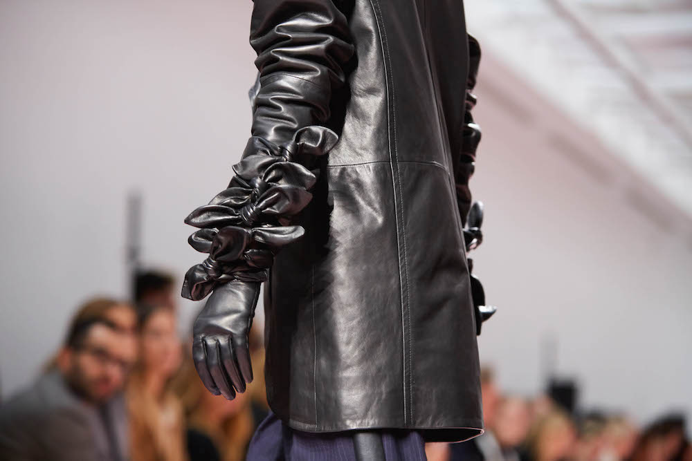 Future Feminism: The marvelous universe of mimimalism emerges in leather + ruffles at DROMe fw17. 80’s Punk influences the romanticism of designer Marianna Rosati, who mixes in feminine details with oversized masculine shapes. Metallized nappa leathers mix with high gloss mirror-effect leather in color, with little frilly details adding fluidity to balance the fantastic volumes.