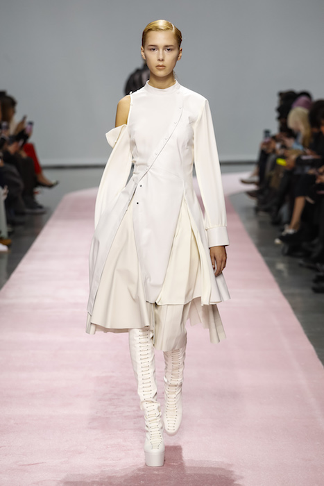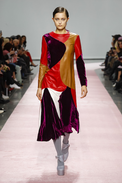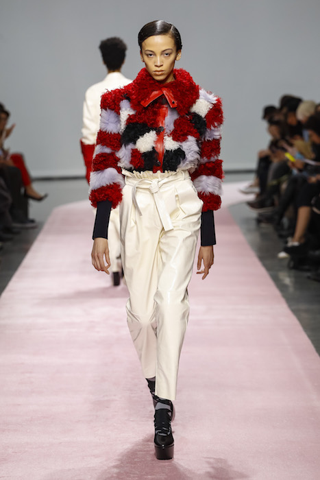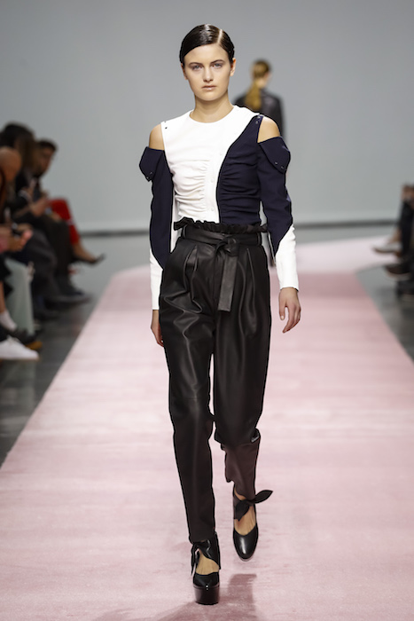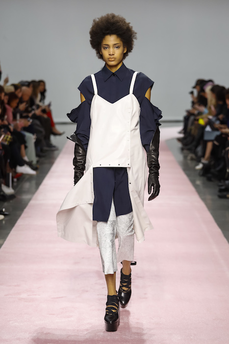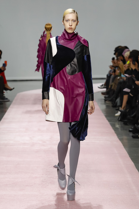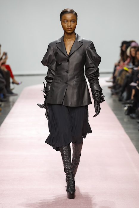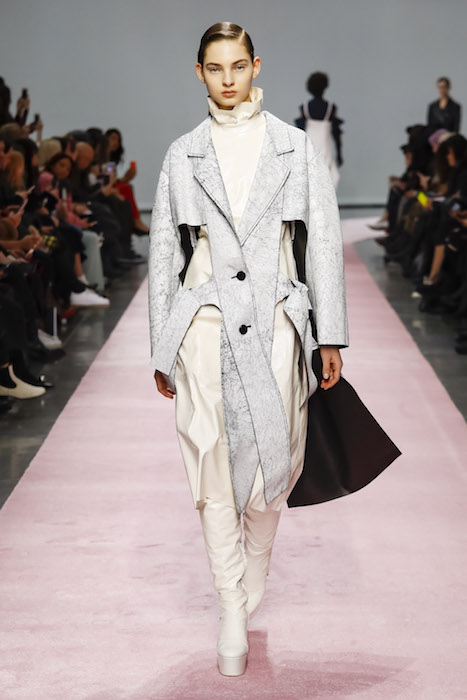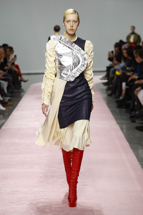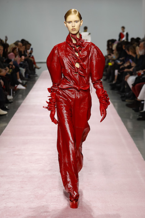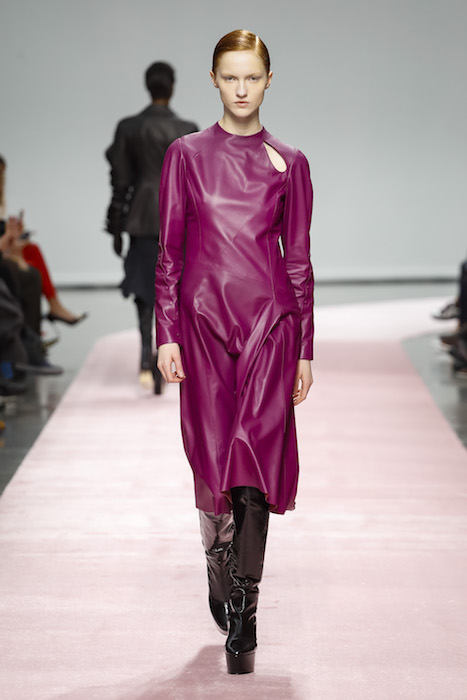 Future Feminism: The marvelous universe of mimimalism emerges in leather + ruffles at DROMe fw17. 80’s Punk influences the romanticism of designer Marianna Rosati, who mixes in feminine details with oversized masculine shapes. Metallized nappa leathers mix with high gloss mirror-effect leather in color, with little frilly details adding fluidity to balance the fantastic volumes.