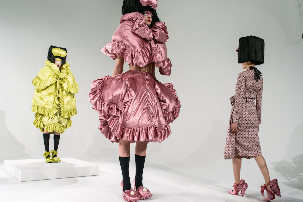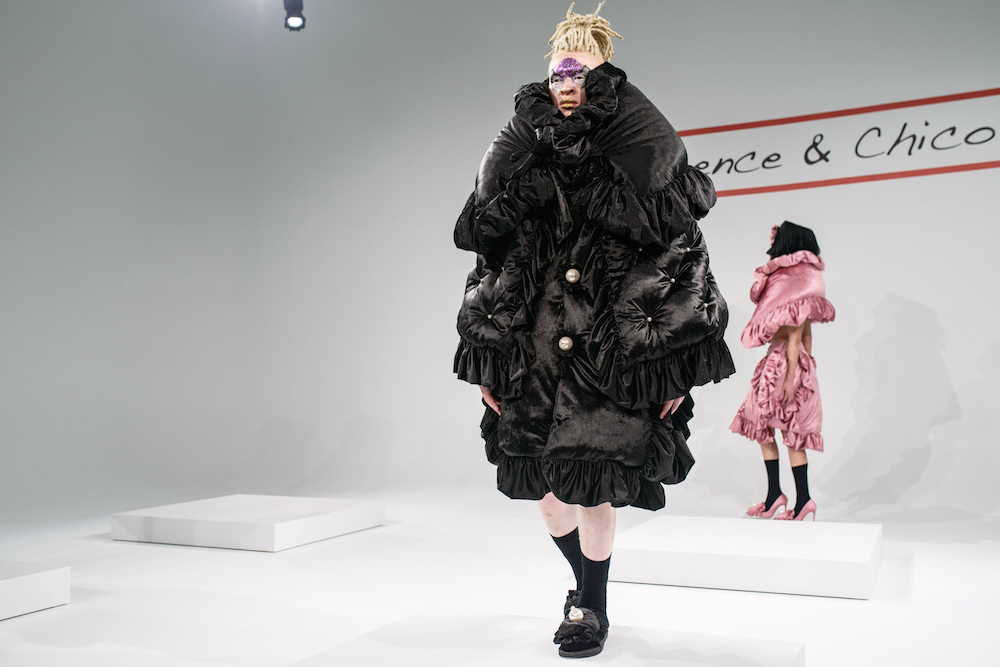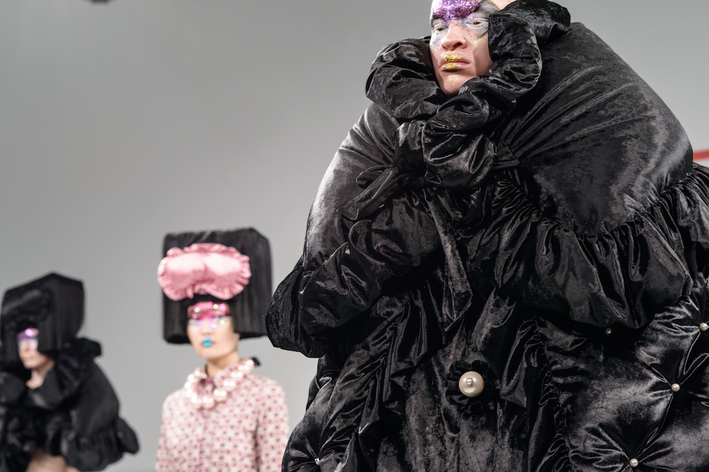 Take a look at this fantastic young designer collection. Sculpted looks, patterns, glittery details, all made with a hand that actually knows construction and drape – an unusual combo for a young designers. The hair and glittery makeup was grand too, in perfect balance with the forward-minded voluminous shapes. Though I loved the collection from this dynamic duo a few seasons ago, they rocked the avant garde young groove enormously this season.