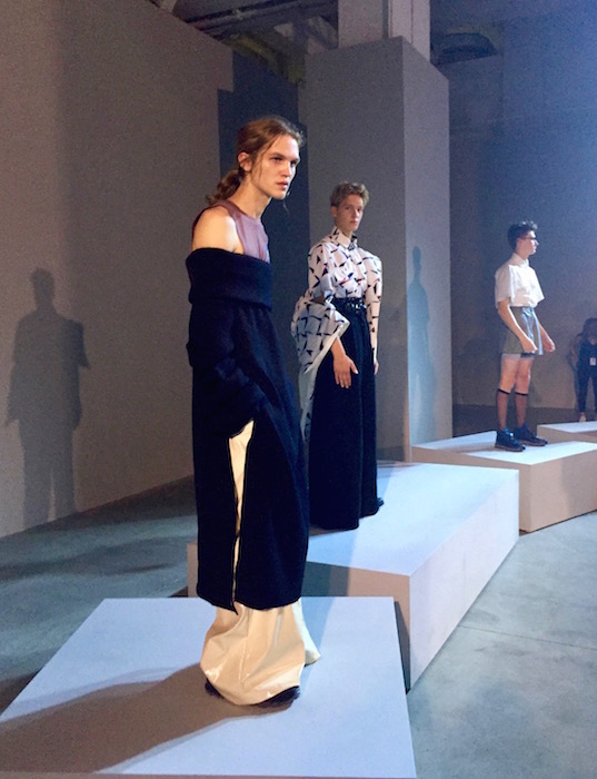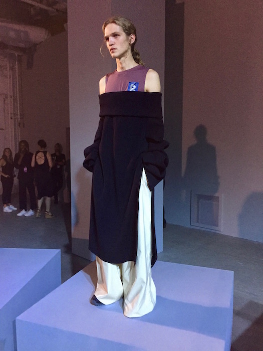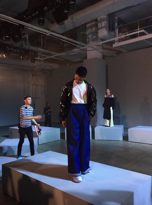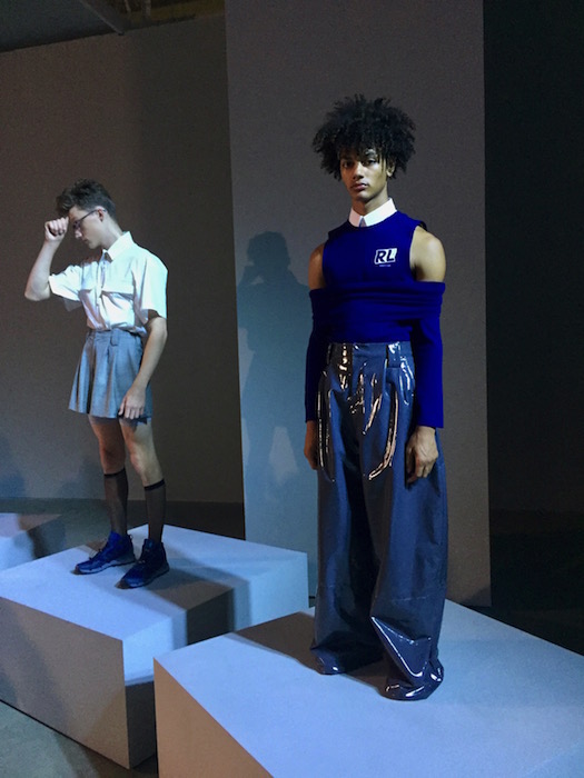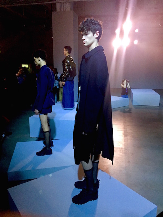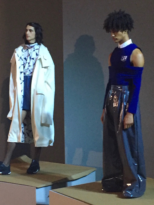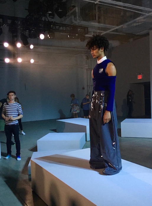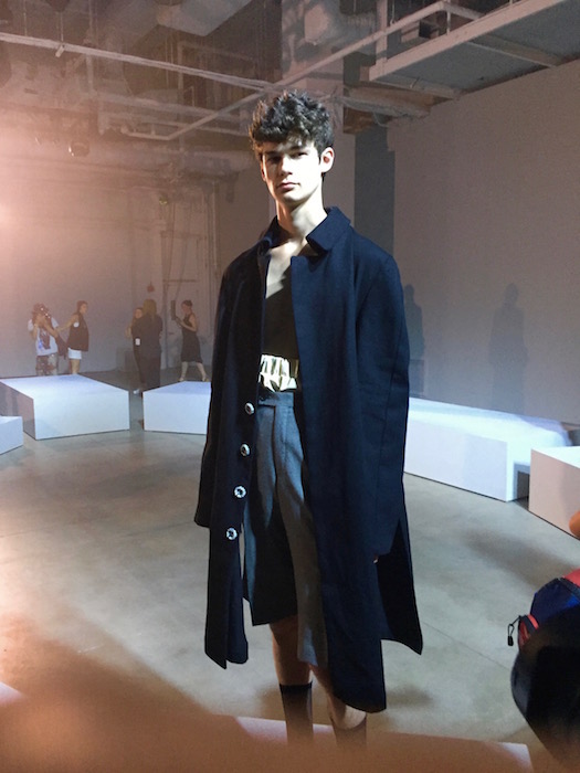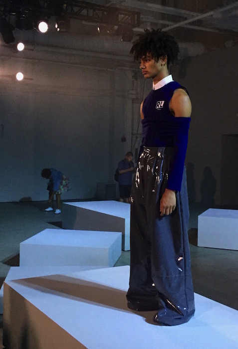 UP CLOSE: A fresh mix of fluid, fresh and young menswear with a sculptural punch! I caught a hot fashion glimpse behind the scenes at RAUN LAROSE ss18 during NYFW:M. The capsule of cool flaunting unsual menswear cuts include wide leg pants and skirts with layers of style.