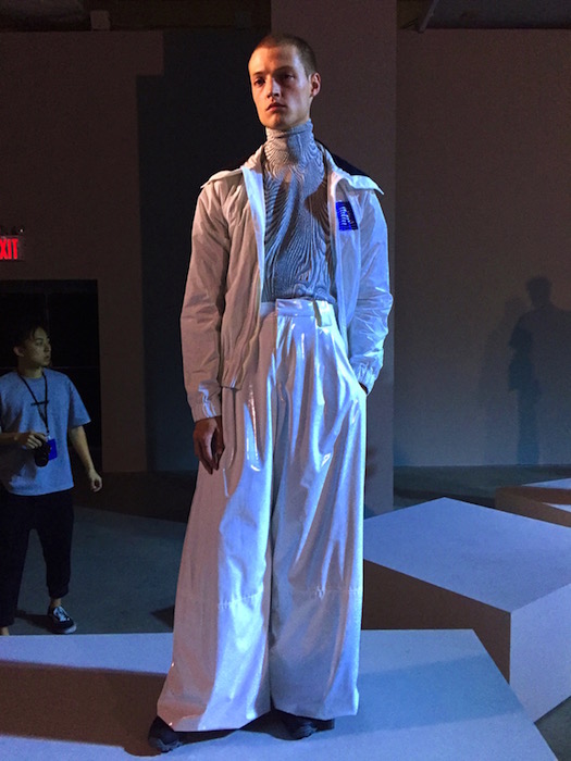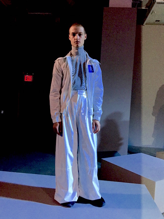 Owning the chic man look, Dane Bell flaunts one of my fave looks in the white on white wide-legged trousers. The blue knit shirt with the wide leg plastified pant was also a standout… and the sculptural outerwear piece styled all tied up. Here’s what I saw, and a few a few of my favorite things.