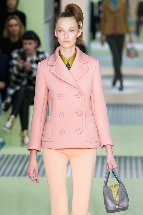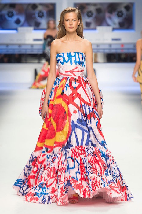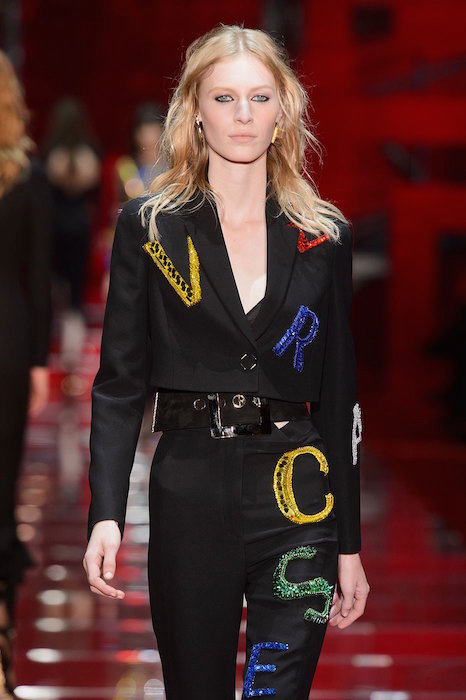 Sparkled greetings from the Milan fall winter 2015 runway. From Costume National‘s blocks of modest sparkle on sheer blacks to VERSACE‘s bold and spelled out bling parade, Milan has the shine groove on. Though Prada was more modest in flash appeal, Miucci’s pasteled jewels were like feminine candy. Handy with Jeremy Scott’s candy appeal, Moschino brought Graffiti + cartoons to the runway, with GiGi Hadid making an appearance in a floor length serious number (except the serious part).