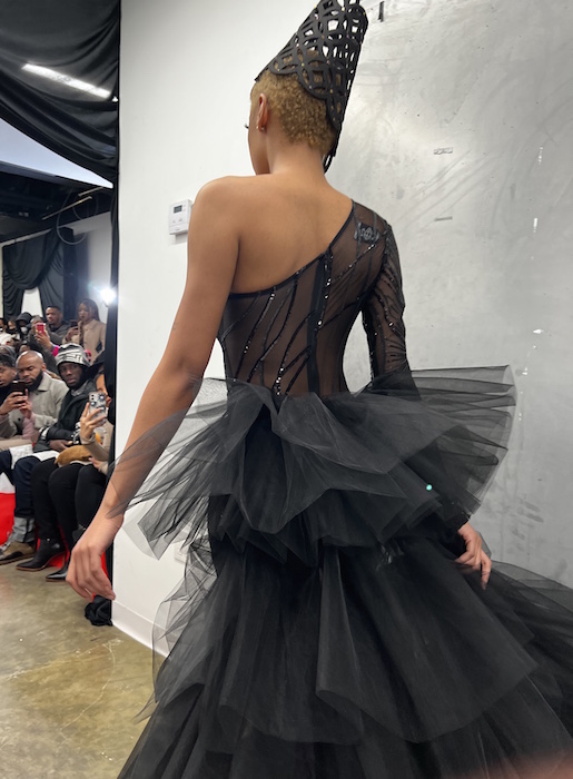 D’angelo’s pieces exude attitude in layers, from short dresses with super large sleeve ruffles to flowing gowns in black on black on black toile!