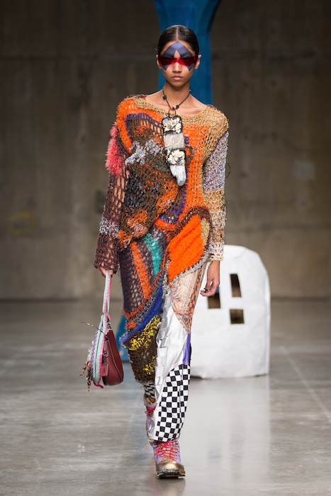 MATTY BOVAN folklore signs and symbols. “Working with stylist Katie Grand, Bovan’s collection showcased his love of fabrics and colours rejected by conventional taste. Vinyl, velour and diamantes in a rainbow of synthetic and saturated tones were knitted, shredded, crocheted, woven and piled together with sculpted jewelry.” @mattybovan.