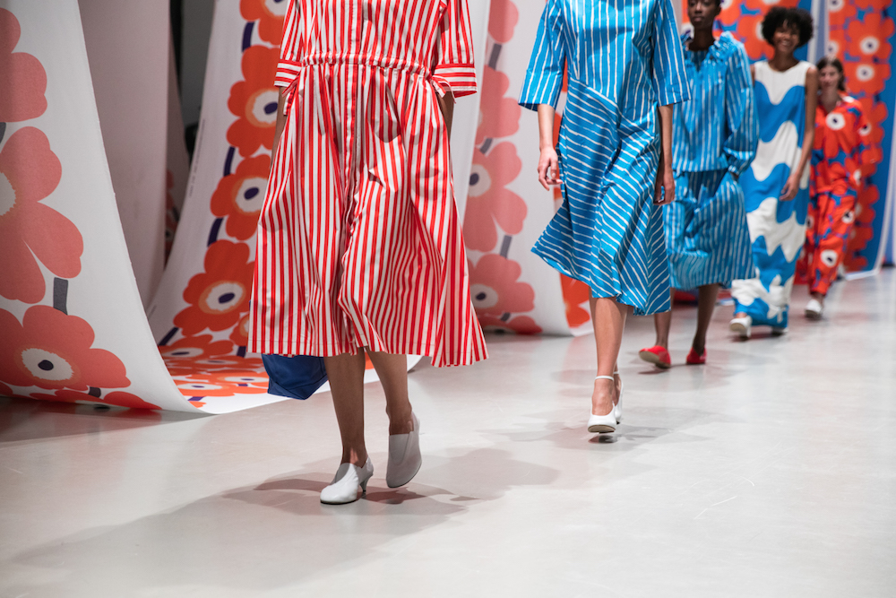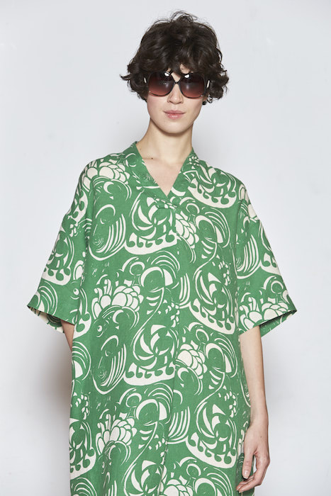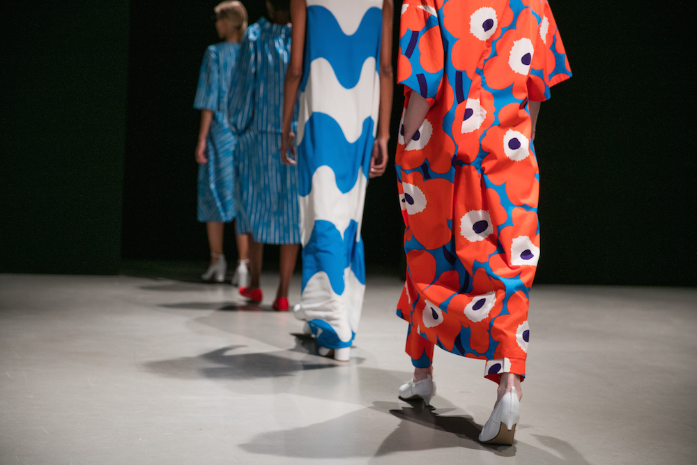 As most collections from Marimekko, bold prints are seen in crisp primary colors of yellow, red and blue as well as botanical green. Cotton and linen pieces were created at Marimekko’s in-house factory in Helsinki, where around a million meters of fabric are printed every year. The printing mill serves as both a factory and as an innovative hub for Marimekko’s creative community.