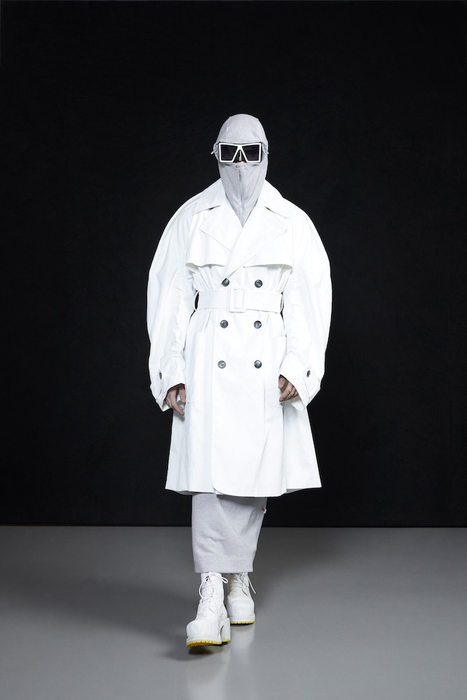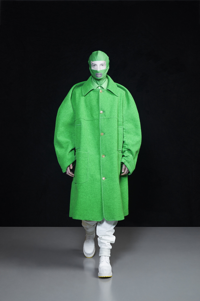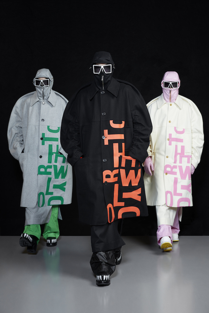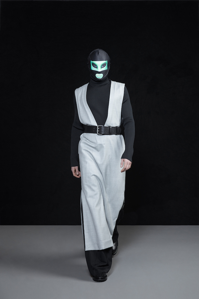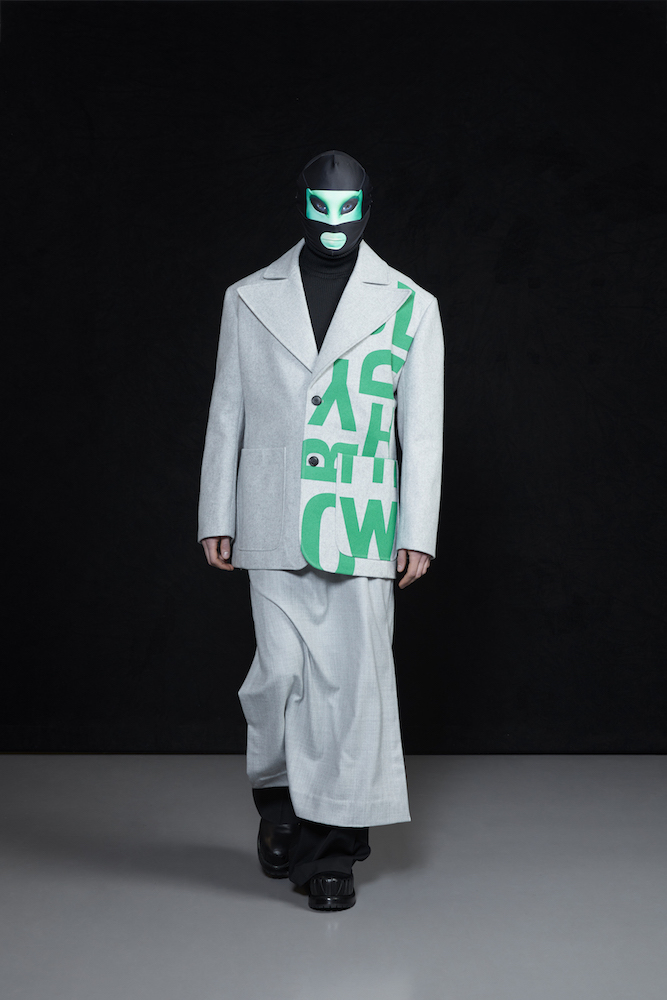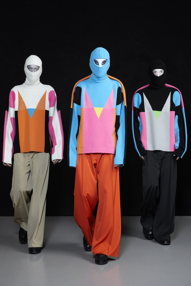 the COOL Daddy of forward fashion does it again. Futuristic vibed + oversized, the edgy and crisp tailored outerwear and jackets boldly makes a BIG and supersized statement. In his “OtherWorldly” collection, oversized jackets with masked models in 3D teethy platforms give us Walt’s futuristic cues. Cool vibes, multicolor graphics on sweaters, and lots of textural outerwear, tailored for everyday DRAMA.