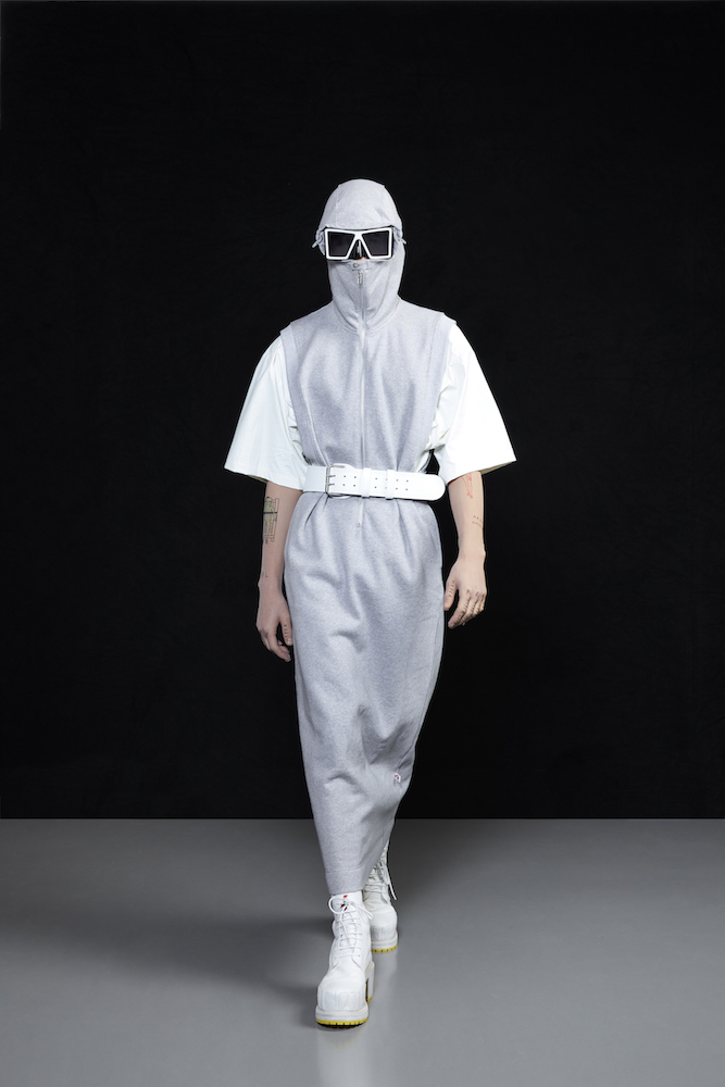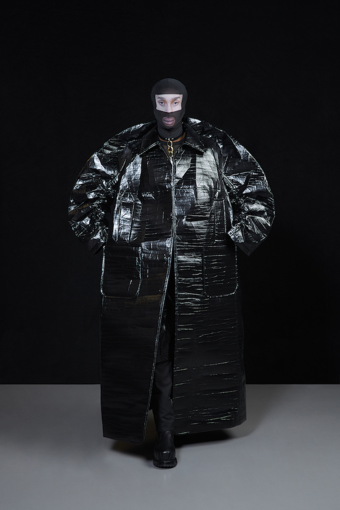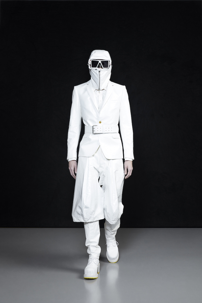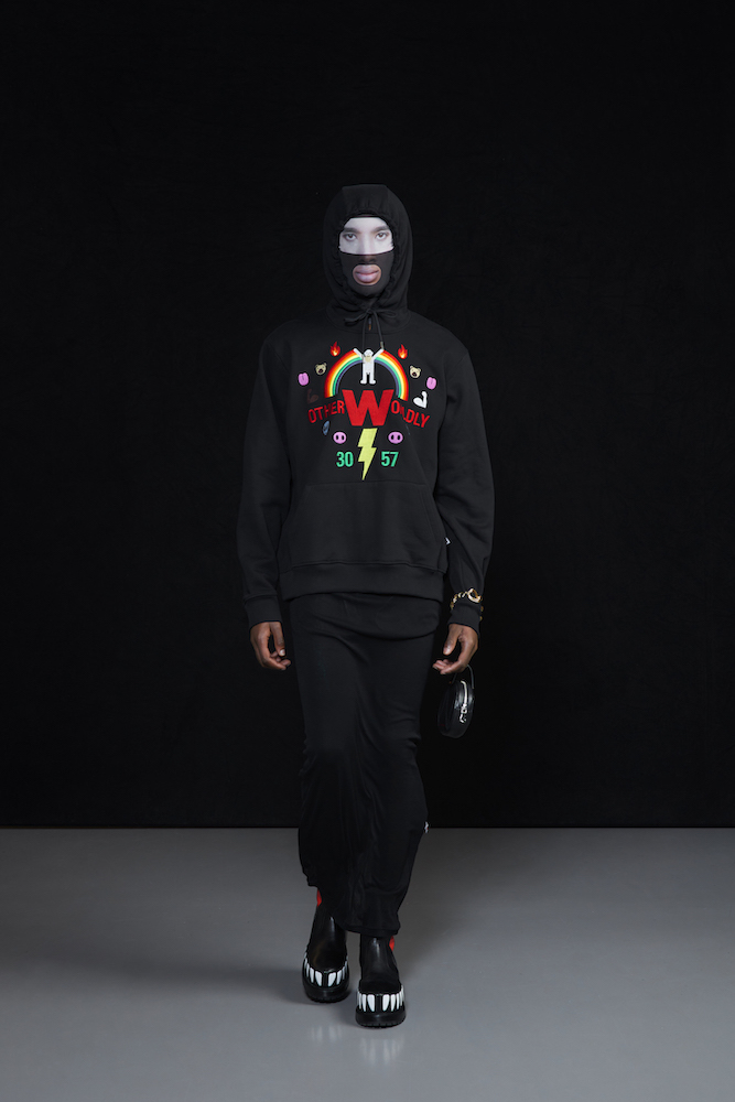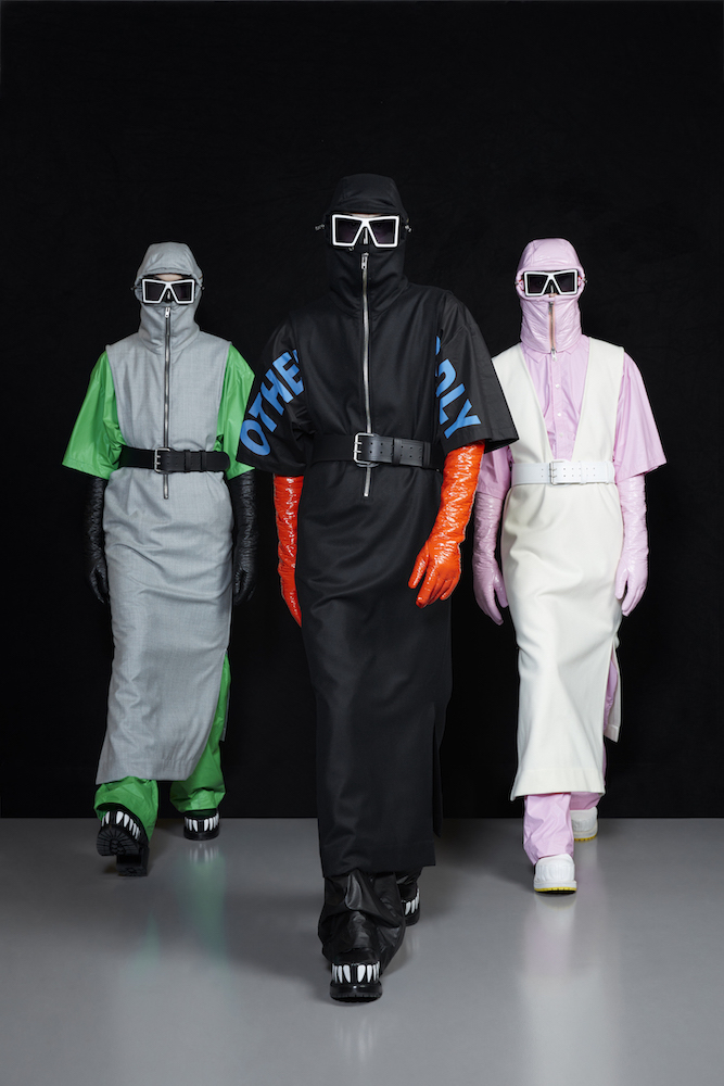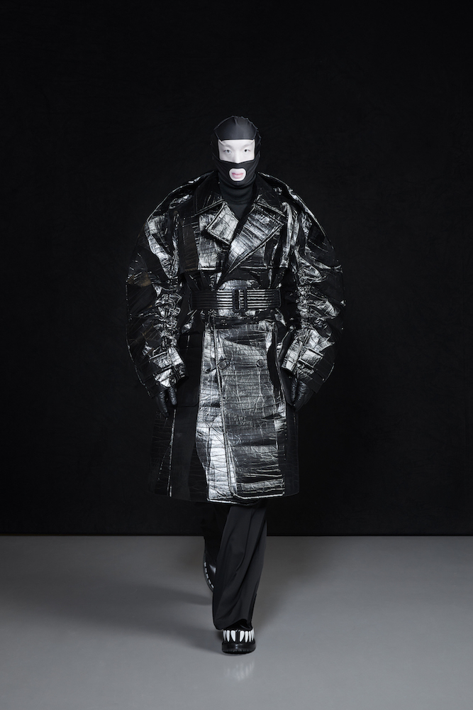 the COOL Daddy of forward fashion does it again. Futuristic vibed + oversized, the edgy and crisp tailored outerwear and jackets boldly makes a BIG and supersized statement. In his “OtherWorldly” collection, oversized jackets with masked models in 3D teethy platforms give us Walt’s futuristic cues. Cool vibes, multicolor graphics on sweaters, and lots of textural outerwear, tailored for everyday DRAMA.