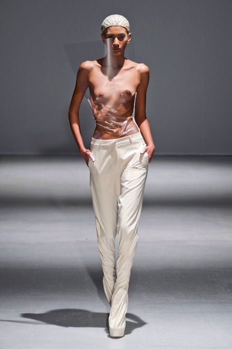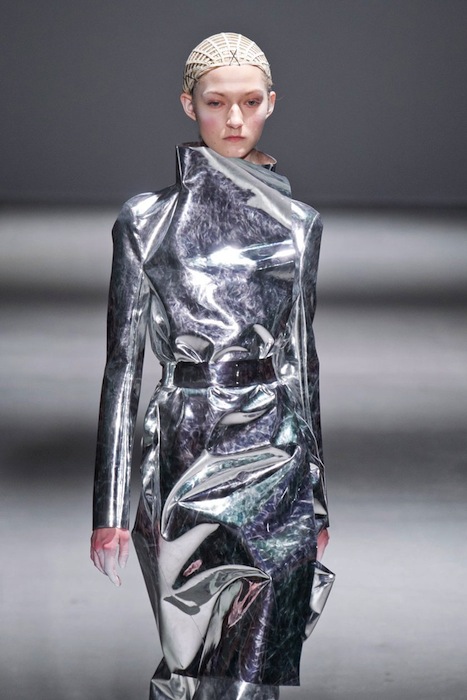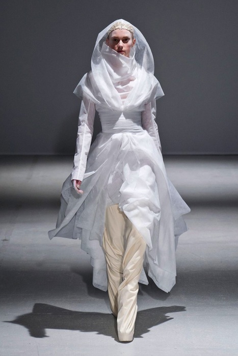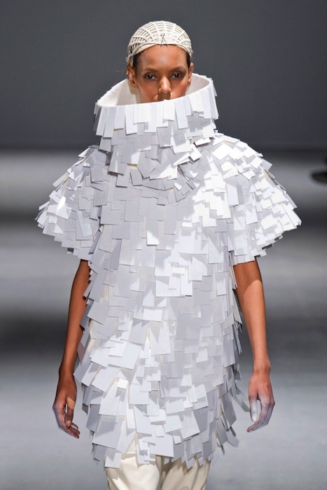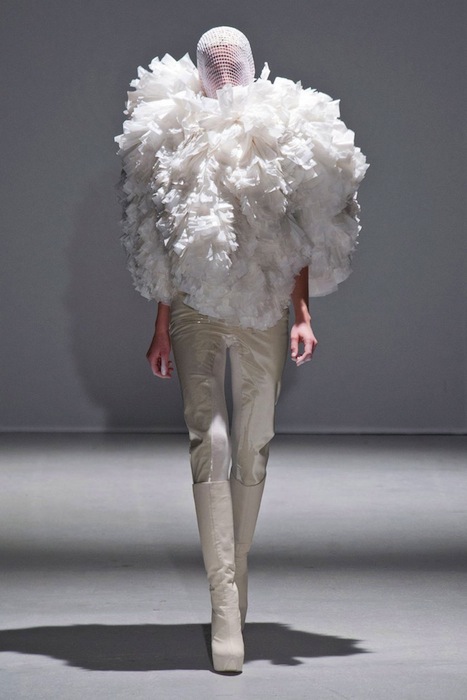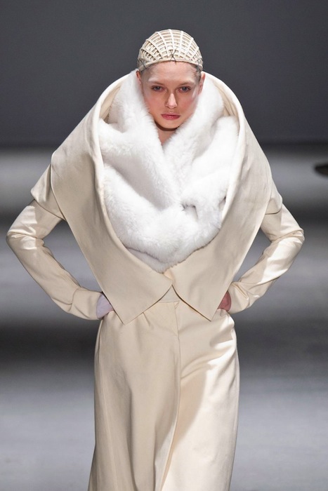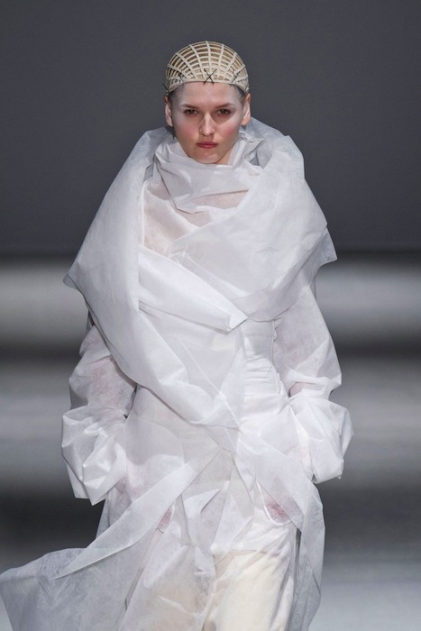 Here we go with Paris Fashion Week. Starting out coverage crisp and draped fresh with Gareth Pugh‘s fall 2014 collection shown during PFW. Though some of the fabrications look a bit airy for winter weather, the whites and neutral palette with silver iridescent peaks is just the dose of fresh we needed. Expirements with shapes + voluminous textures, and lightly wrapped and draped.