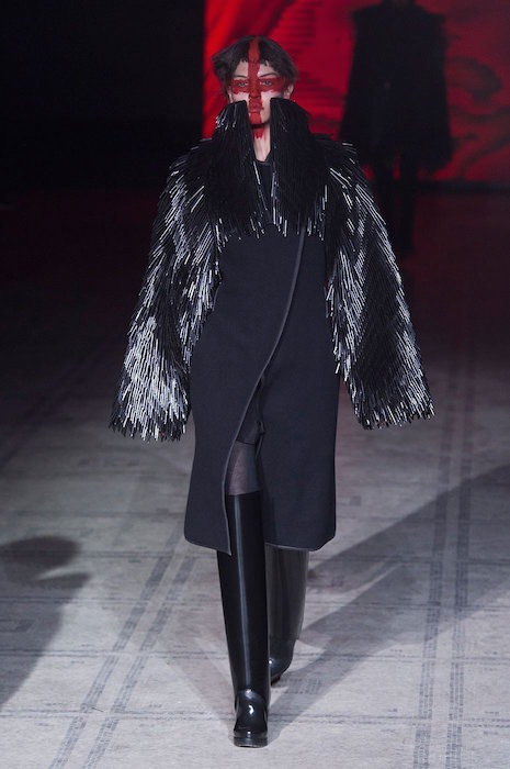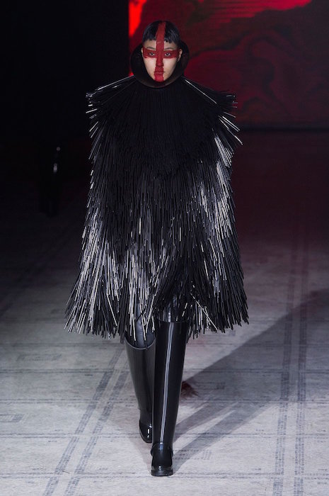 A sea of scuplted darks at GARETH PUGH aw15 runway during London Fashion Week. From sculpted + spiked fringe appearing in dresses and jackets to puffy darks meant to make a grande dark statement. Clean silhouettes in textured looks + leathers go from a (dark) day to night.