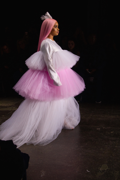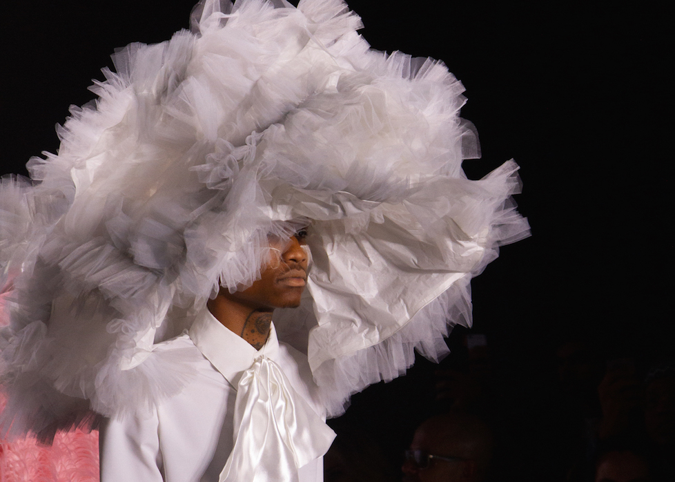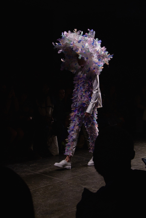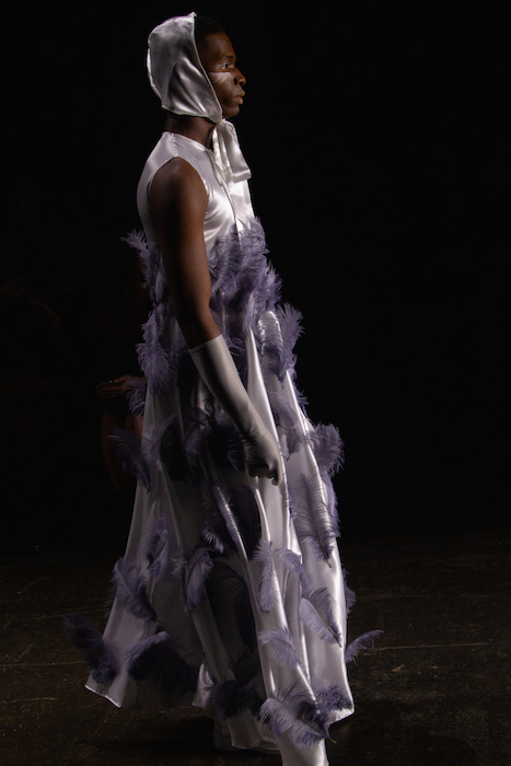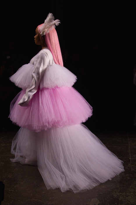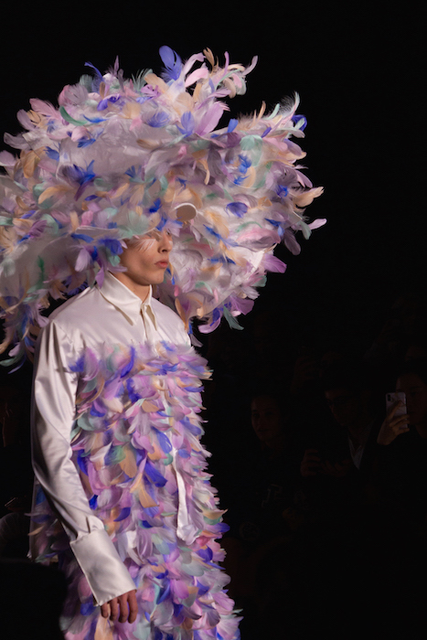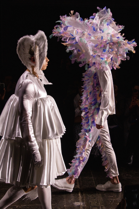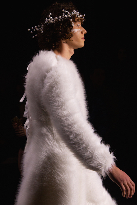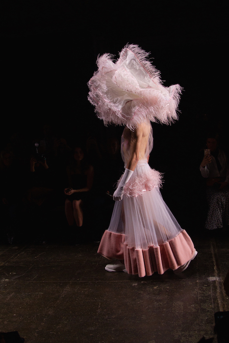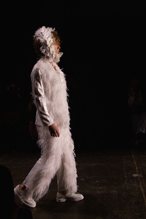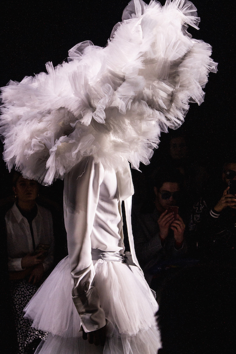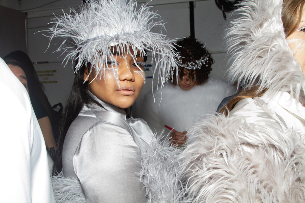 Highlights behind the scenes and frow. Young designer Allessandro Trincone flaunts genderless looks for Fall 2019 NYFW. A parade of Feathered, voluminous, and baby doll looks were fluttering on the catwalk in shades of pale.