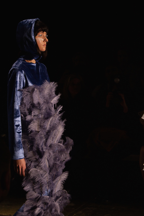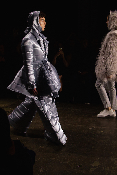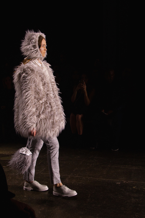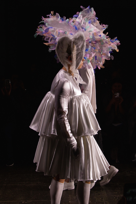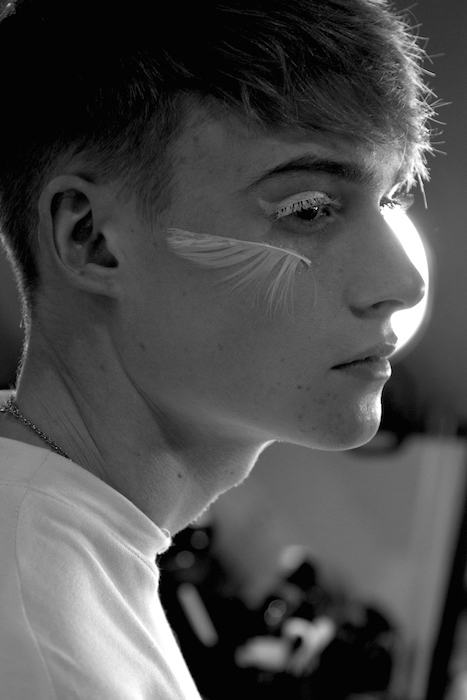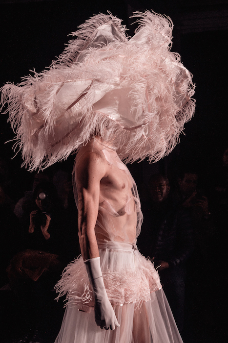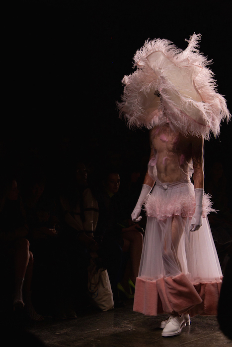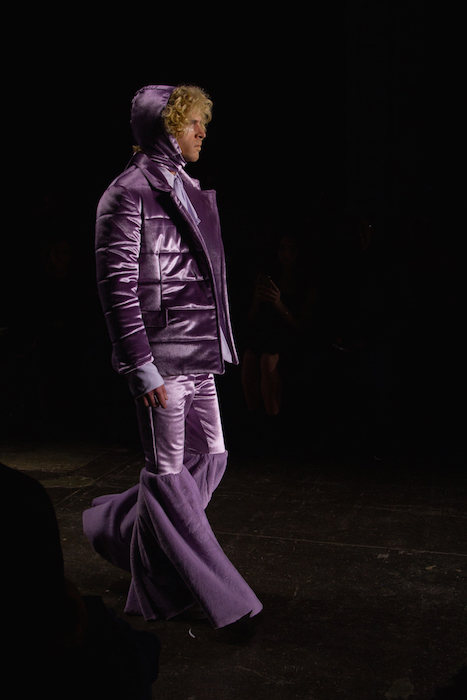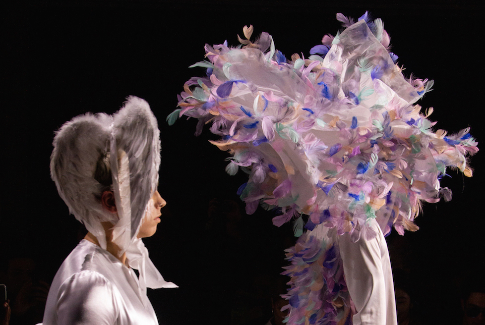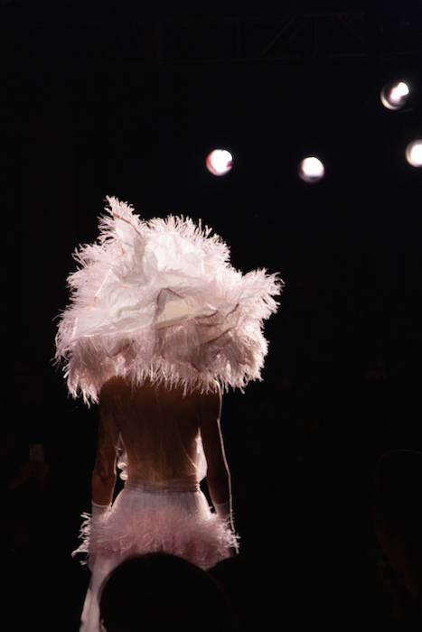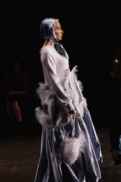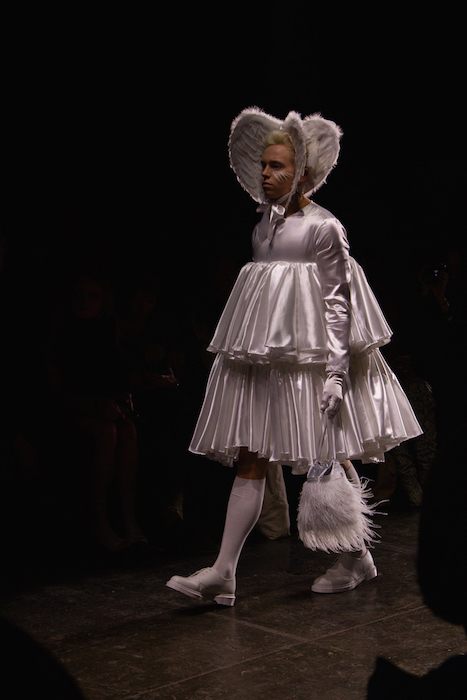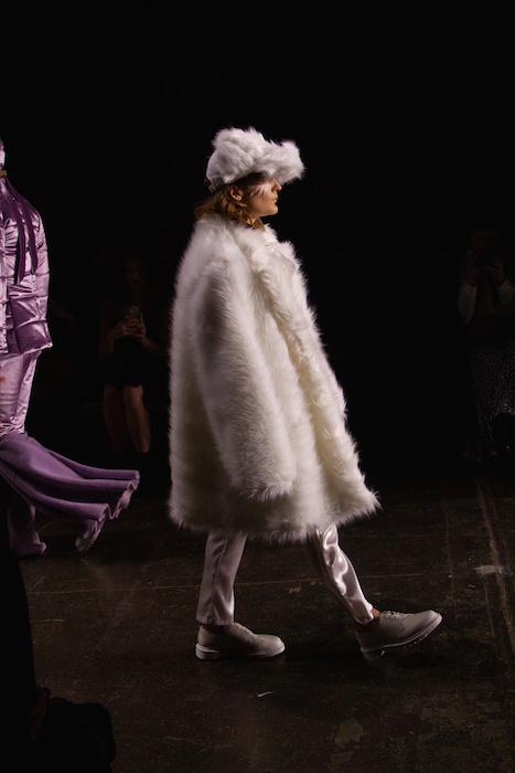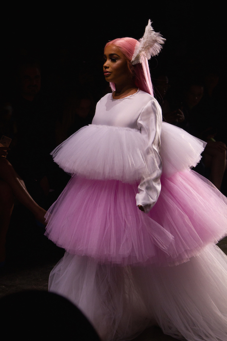Highlights behind the scenes and frow. Young designer Allessandro Trincone flaunts genderless looks for Fall 2019 NYFW. A parade of Feathered, voluminous, and baby doll looks were fluttering on the catwalk in shades of pale.