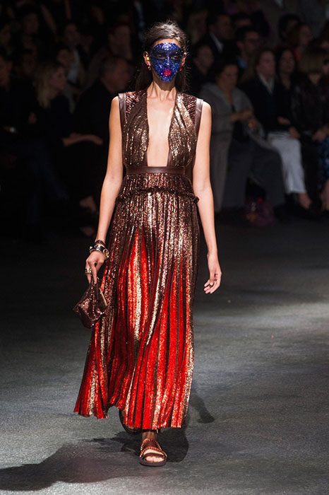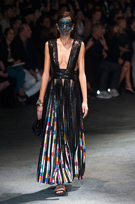 Gorgeous draping can be very alluring. Givenchy’s Spring 2014 collection achieves this, and then some. Designer Riccardo Tisci is a self-professed lover of draping extraordinaire, Madame Grès. He’s also greatly inspired by traditional Japanese kimonos and fabrics used in African and Indian clothing for this set. A tribal sense is felt all over, including the magnificent glued crystal faces on the models. Everything is a fierce tour de force.