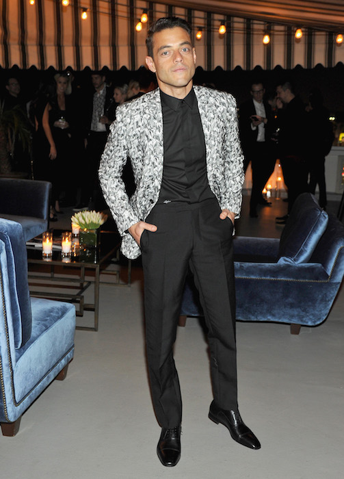Rami Malek wore a Dior Homme white wool barathea two-button peak lapel jacket with all over “Lily of the Valley” embroidery, black cotton shirt, and black wool trousers.