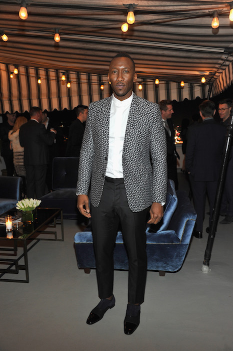 Mahershala Ali wore a Dior Homme black cotton and wool jacquard two-button jacket with “Fleurs Mr. Dior” motifs, white cotton cutaway collar shirt and black wool trousers.