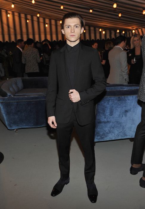 Tom Holland wore a Dior Homme black wool peak lapel suit and black cotton shirt.