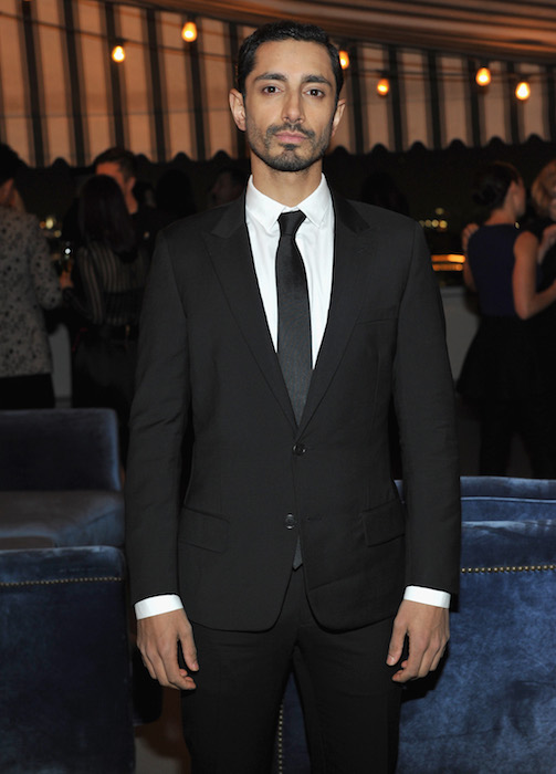 Riz Ahmed wore a Dior Homme black wool two-button peak lapel suit, white cotton shirt and black silk tie.