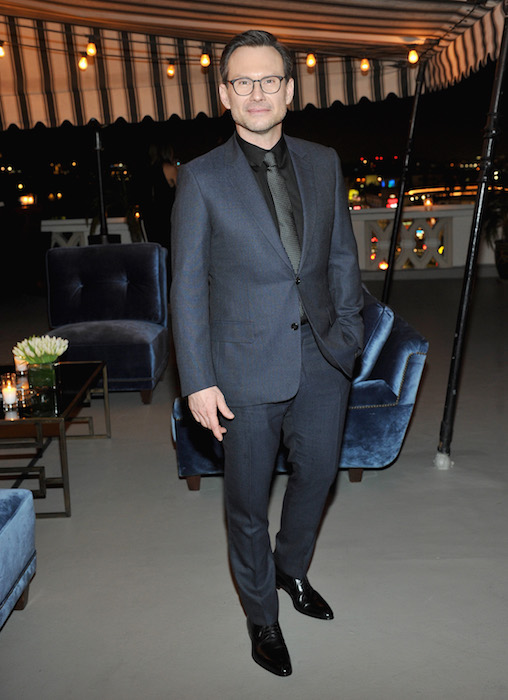 Christian Slater wore a Dior Homme blue wool suit, black cotton shirt, and black and white silk tie.