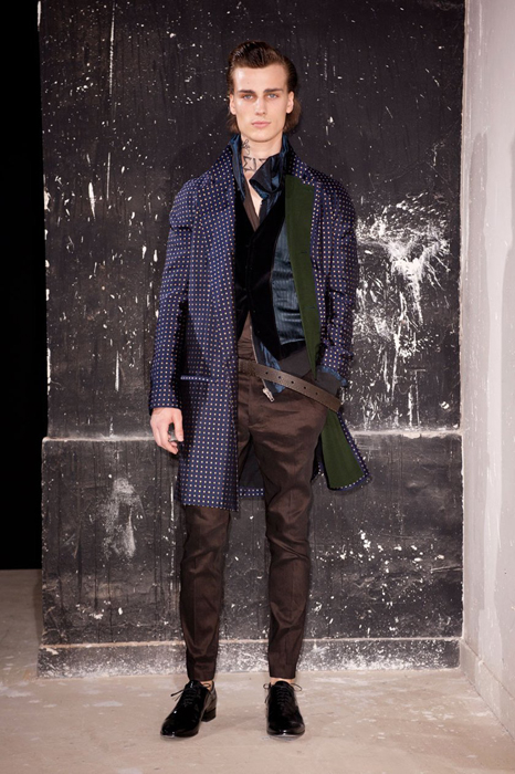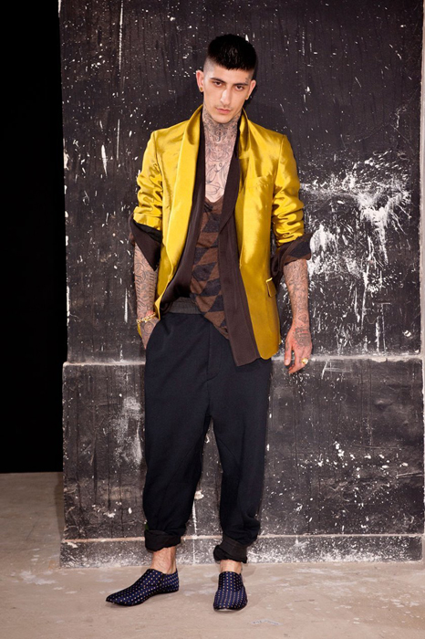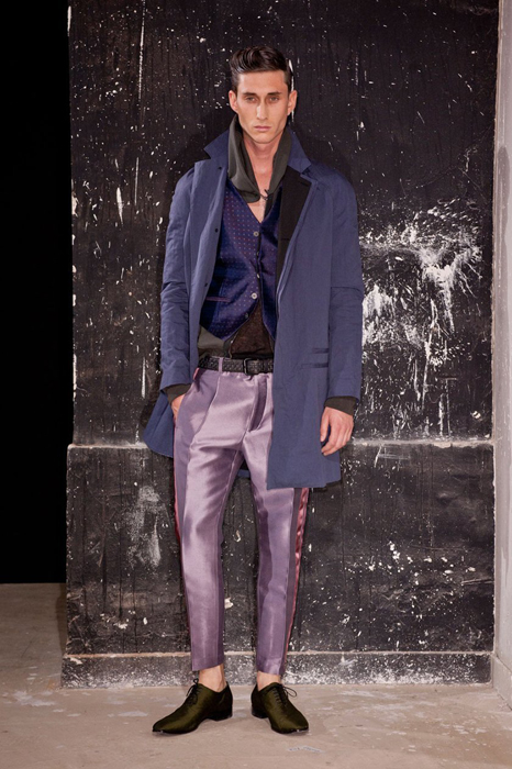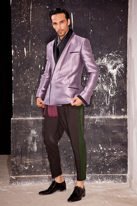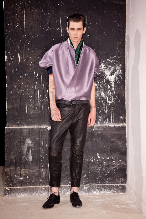 Many designers have been dipping into menswear this season. Haider Ackermann is one who decided to foray into men’s apparel. He nailed it with this uber masculine set for his Menswear spring 2014 collection. Sticking with typical romantic jewel tone hues and standard slouchiness, these pieces lay beautifully on the tattooed models. Possessing a sense of hard glamour, the designer is showing that even the toughest of guys wear stunning clothes. Everything is literally shining here. No sunglasses needed…these pieces deserve to be taken in fully.