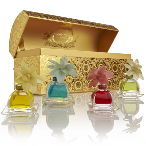 This beautiful set of PetiteEssence™ Santa Barbara comes in 4 jewel-toned fragrances. Mediterranean Jasmine, Lime + Orange Blossoms, Cedar Rose and Golden Cassis. Presented in Agraria 45th Anniversary Commemorative Box, with 4 glass trays + 4 sola flowers. [set,$175].