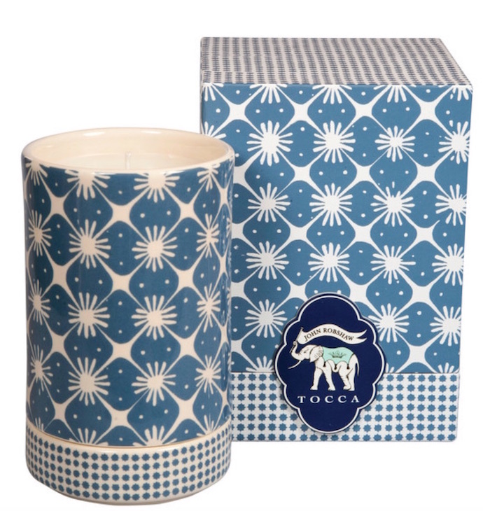 TOCCA x John Robshaw in a Far East-inspired candle collection. In the first ever collab, Tocca recreated the energy and aromas of some of John’s favorite local markets and beaches to bring them to you in custom, handmade ceramic vessels. Each distinctive design is based on prints from the archives of the iconic textile designer. Escape in fragrances that pay homage to the romantic tales of John’s faraway travels. The Java John Robshaw Collection Candle is inspired from John’s first batik printing trip to Java + a local market in Yogyakarta. The fragrance + patterns of that market- clove cigs, coffee beans sold by locals in hand printed batik sarongs. [$60].